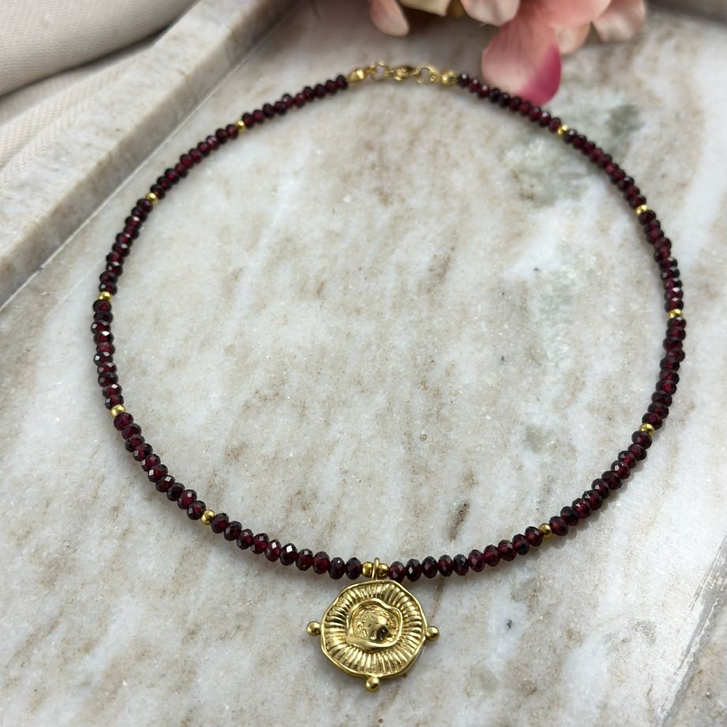 Granátový náhrdelník s přívěskem. Vstupte do světa elegance a síly s náhrdelníkem Velora, kde se precizní ruční práce snoubí s energií přírodního kamene. Tento jedinečný šperk je tvořen z pečlivě vybraných korálků pravého granátu, jejichž hluboký vínový odstín zaujme na první pohled. Středem pozornosti je jemný přívěsek, který dodává celku osobitý výraz. Každý náhrdelník je originál – vyráběný s důrazem na detail a kvalitu, aby podtrhl vaši osobnost a styl.
