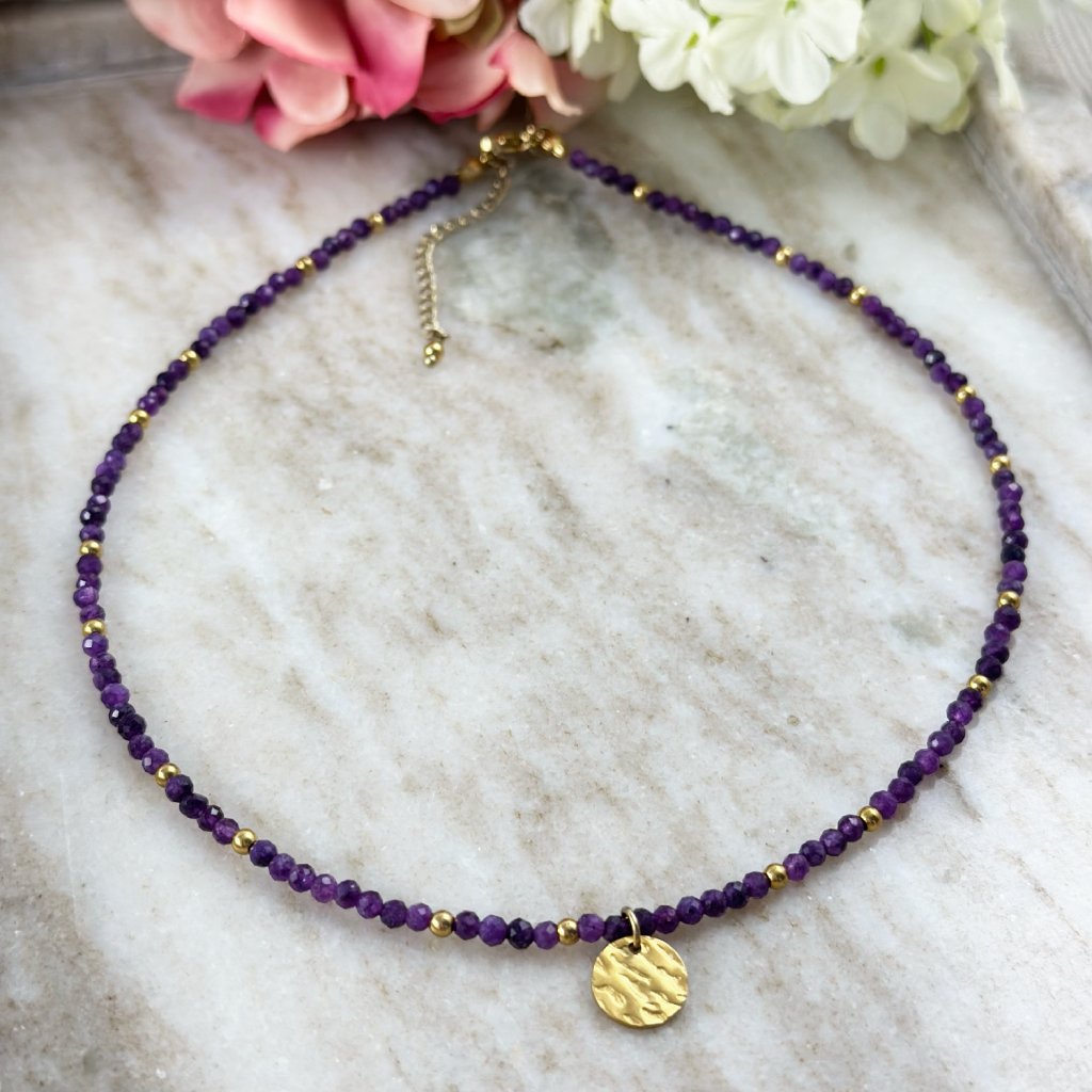 Náhrdelník s ametystem Aurelia. Objevte krásu a sílu přírody s tímto ručně vyráběným náhrdelníkem z pravého ametystu. Každý kámen byl pečlivě vybrán a navlečen s láskou, aby vznikl elegantní a zároveň silně energetický šperk. Ametyst je známý jako kámen klidu, intuice a duchovní očisty. Pomáhá tišit mysl, zmírňuje stres a napětí, podporuje meditaci a kvalitní spánek. Ametyst chrání před negativní energií. Ideální jako dárek pro ty, kteří hledají harmonii, krásu a duchovní rovnováhu.