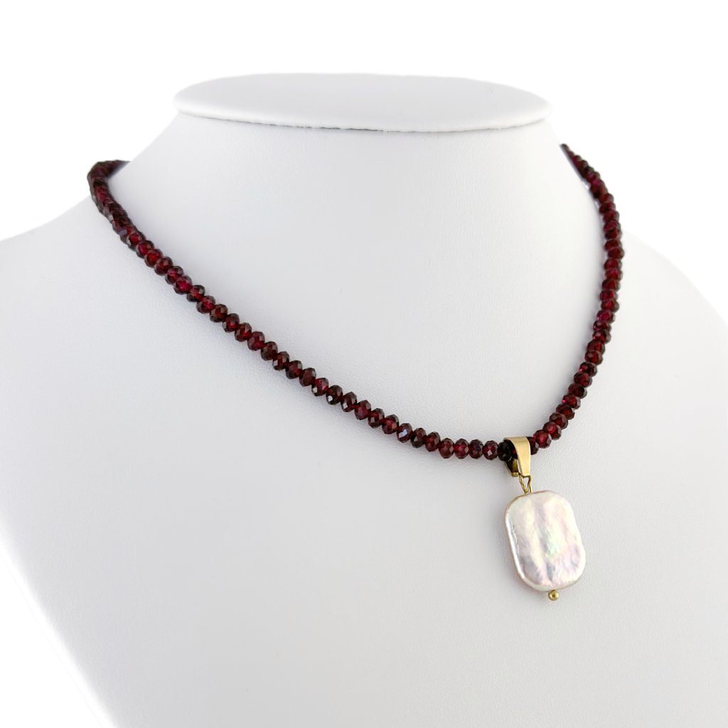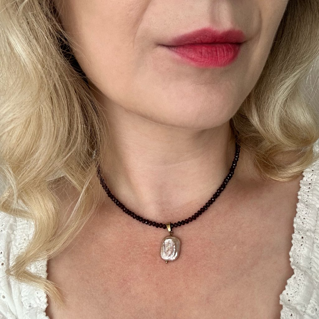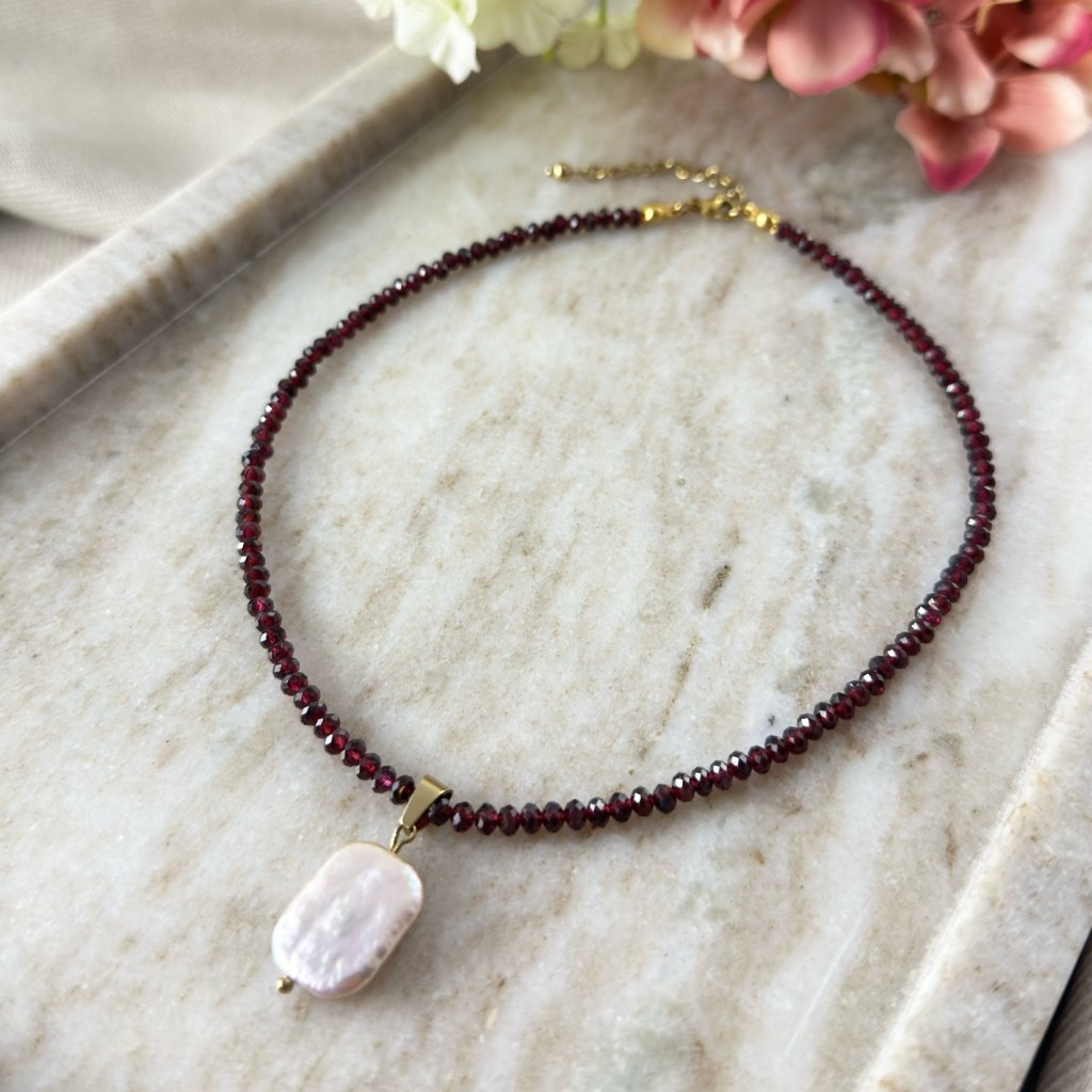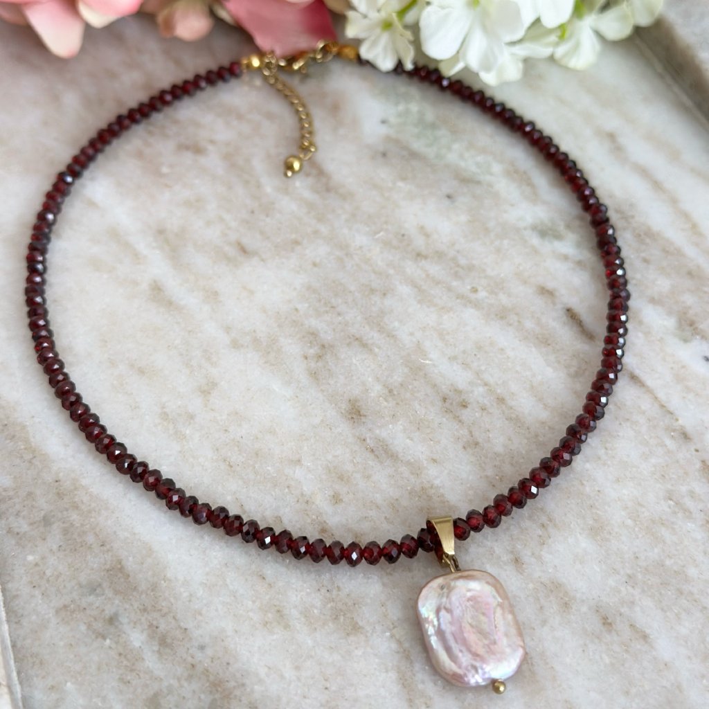 Objevte jedinečný náhrdelník z granátu zdobený výraznou růžovou barokní perlou, který v sobě spojuje sílu přírodního kamene a jemnost perly. Tento ručně vyráběný šperk působí elegantně, žensky a zároveň originálně. Hluboká červená barva granátu symbolizuje vášeň, odvahu a ochranu, zatímco barokní perla v jemném růžovém odstínu dodává náhrdelníku luxusní a neotřelý vzhled. Díky nepravidelnému tvaru perly je každý kus naprosto originální.