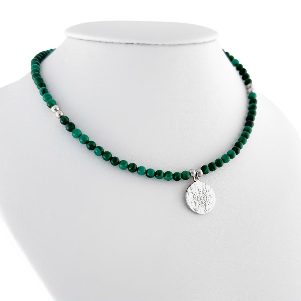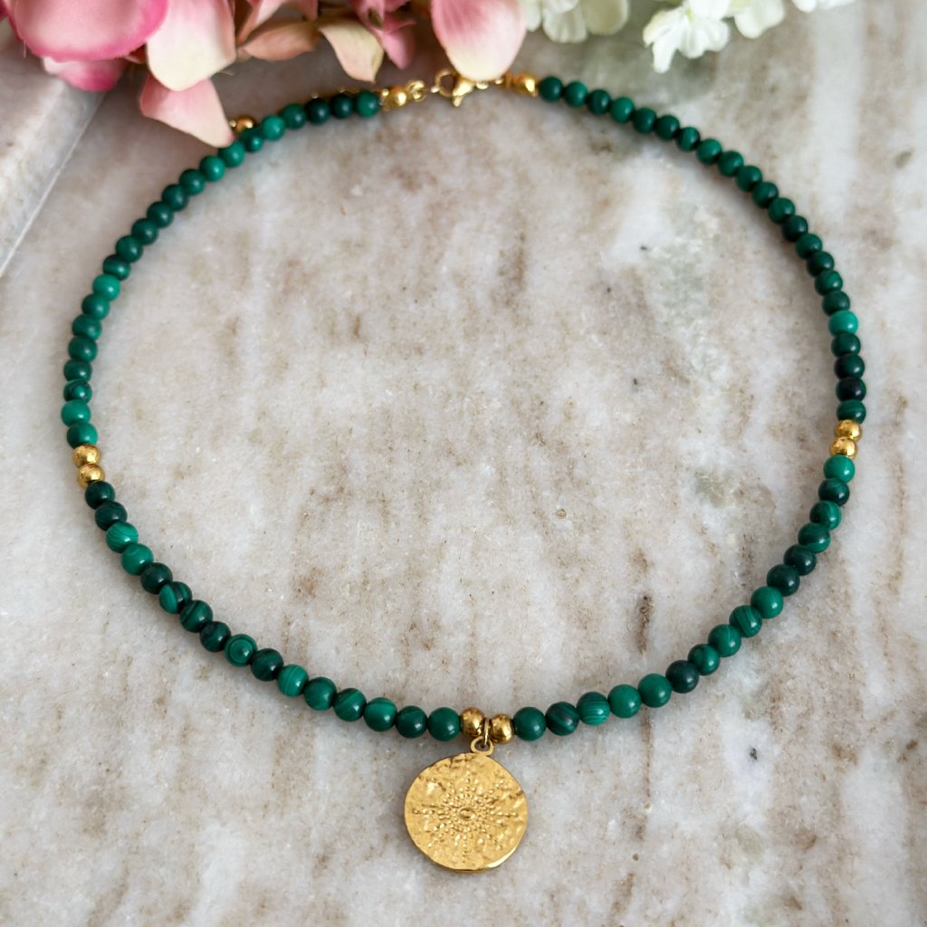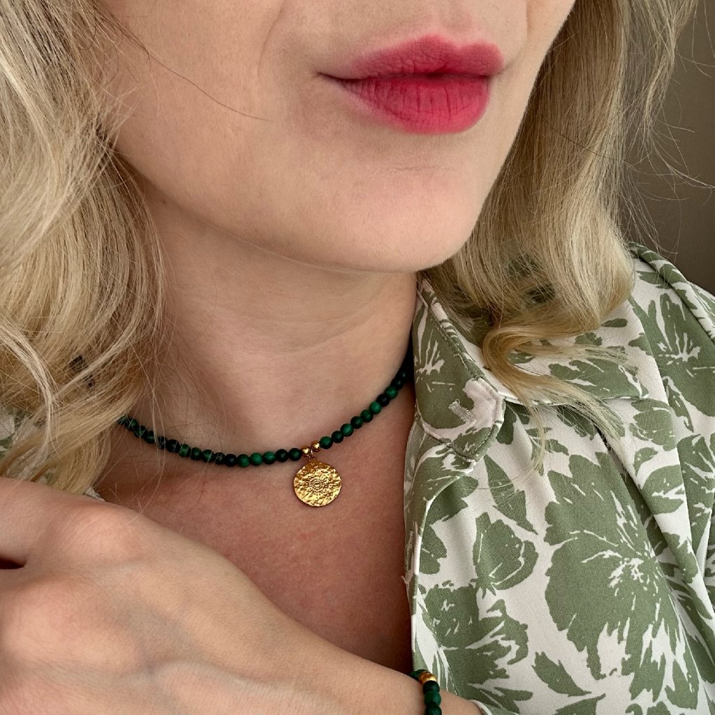 Náhrdelník z malachitu Nemeria. Objevte sílu přírody a krásu ruční práce v náhrdelníku Nemeria – originálním šperku s výrazným malachitem a decentním kulatým přívěskem ve středu. Každý kousek je pečlivě vyráběn s důrazem na detail, aby zdůraznil jedinečnost a osobní styl své nositelky. Malachit je známý svou sytou zelenou barvou a magickými vlastnostmi – podle tradice přináší rovnováhu, klid a ochranu. V kombinaci s minimalistickým přívěskem vzniká harmonický šperk, který spojuje mystiku a moderní eleganci.