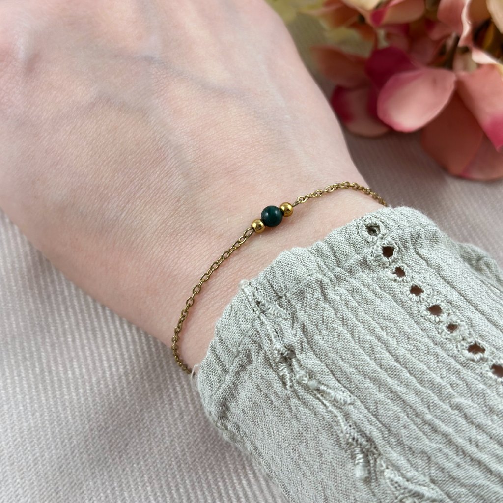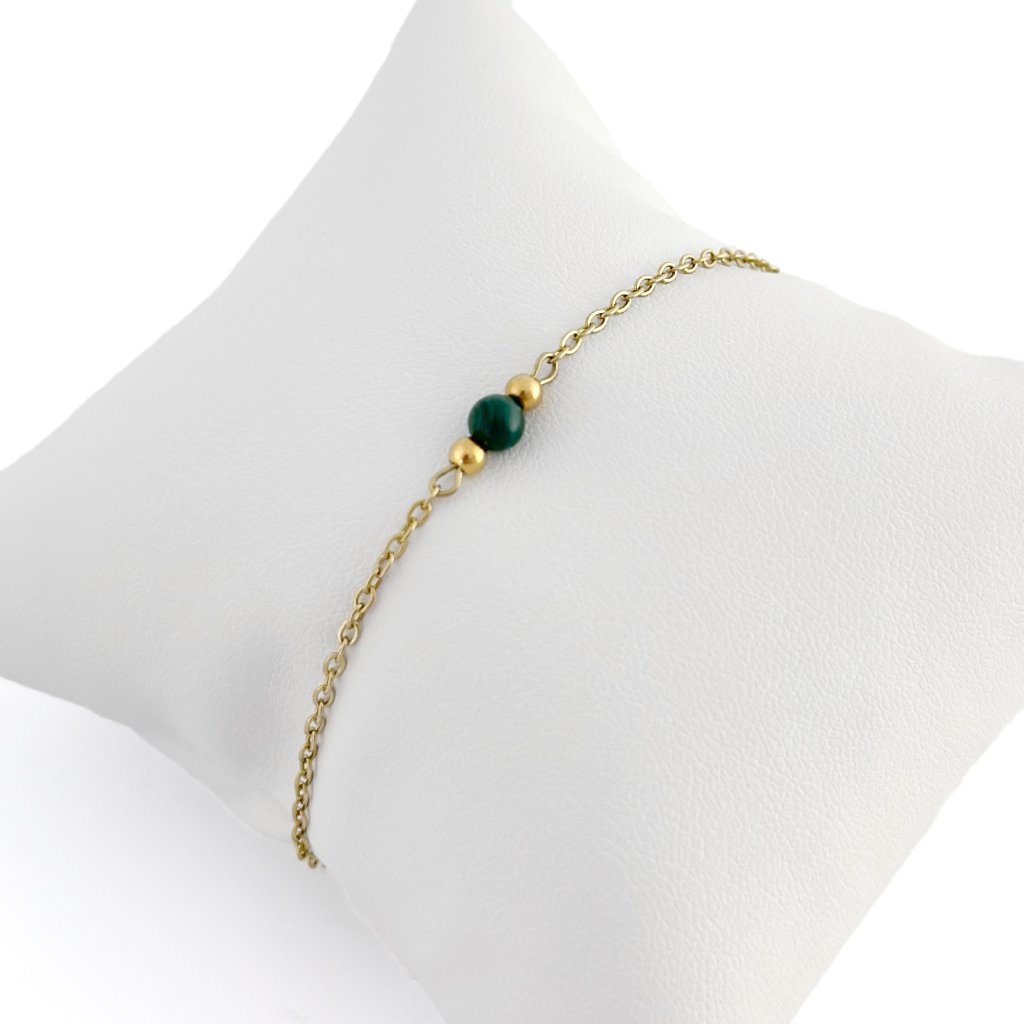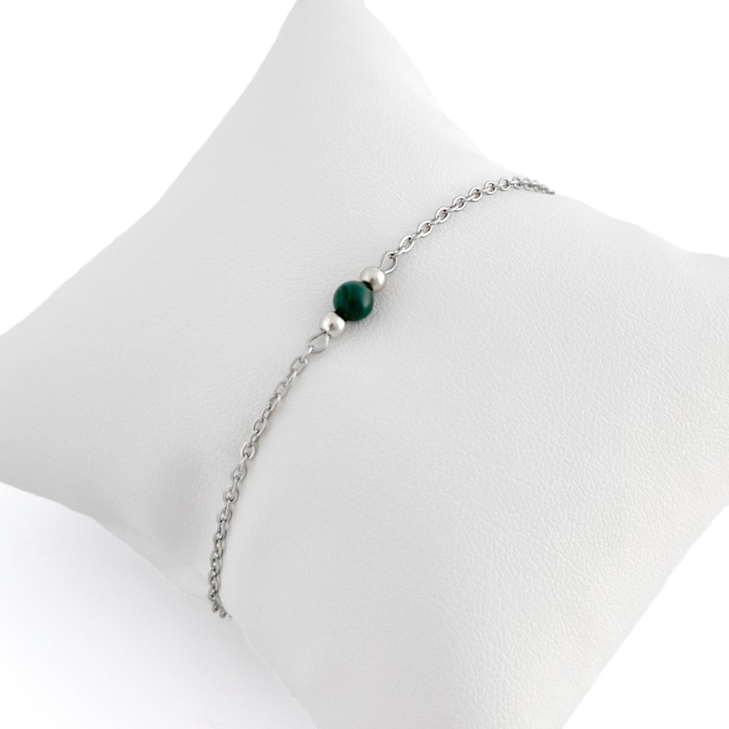 Minimalistický náramek s malachitem. Jemný řetízek z chirurgické oceli zaručuje dlouhou životnost a odolnost vůči opotřebení. Malachit je silně ochranný kámen, který podporuje osobní růst, pomáhá uvolňovat negativní emoce a přináší vnitřní rovnováhu. Je také spojován s transformací a novými začátky. Díky svému elegantnímu a nadčasovému designu je náramek vhodný pro každodenní nošení i slavnostní příležitosti. Skvěle se kombinuje s dalšími šperky. Na výběr ve zlaté i stříbrné variantě. Délku náramku Vám ráda upravím na míru.