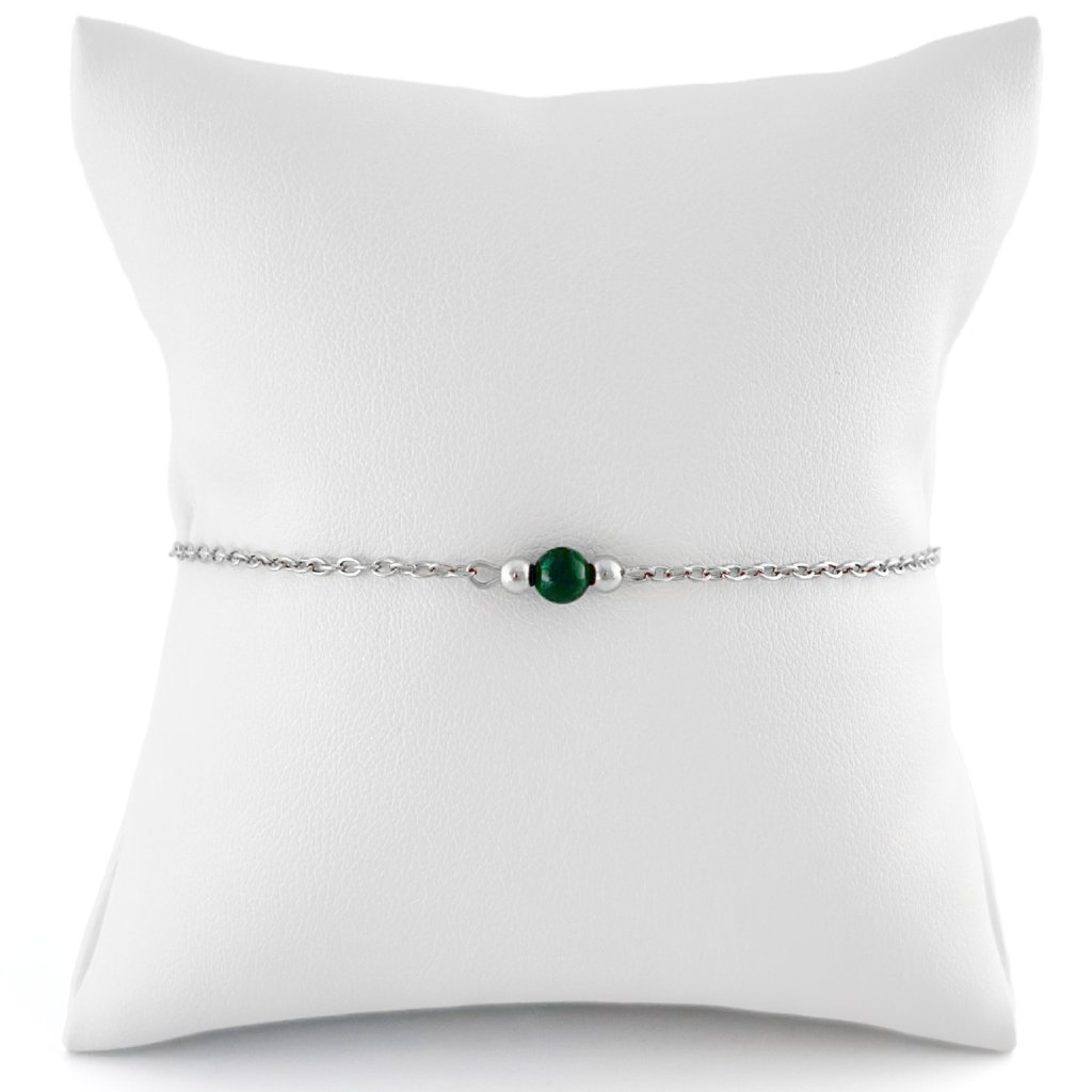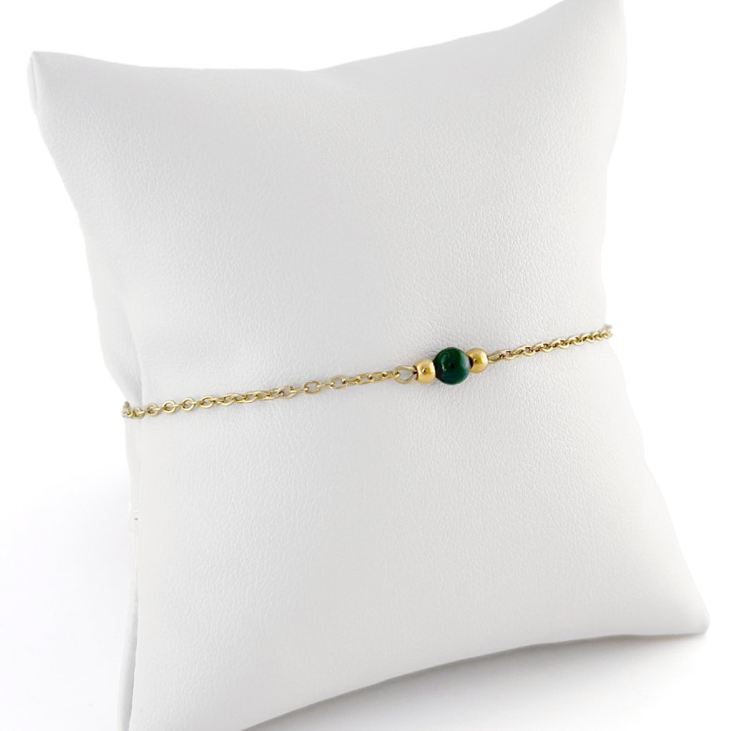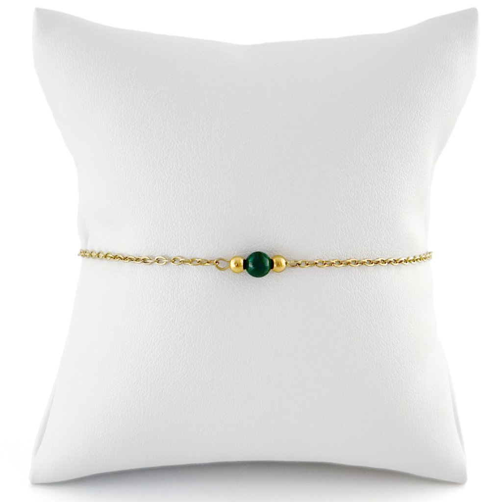 Minimalistický náramek s malachitem. Jemný řetízek z chirurgické oceli zaručuje dlouhou životnost a odolnost vůči opotřebení. Malachit je silně ochranný kámen, který podporuje osobní růst, pomáhá uvolňovat negativní emoce a přináší vnitřní rovnováhu. Je také spojován s transformací a novými začátky. Díky svému elegantnímu a nadčasovému designu je náramek vhodný pro každodenní nošení i slavnostní příležitosti. Skvěle se kombinuje s dalšími šperky. Na výběr ve zlaté i stříbrné variantě. Délku náramku Vám ráda upravím na míru.