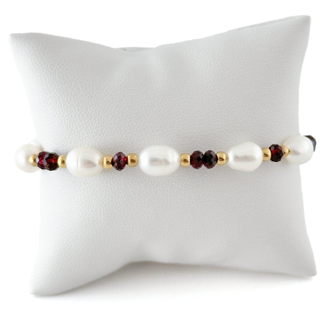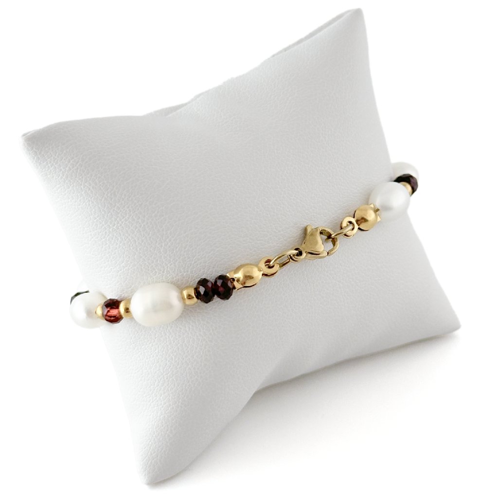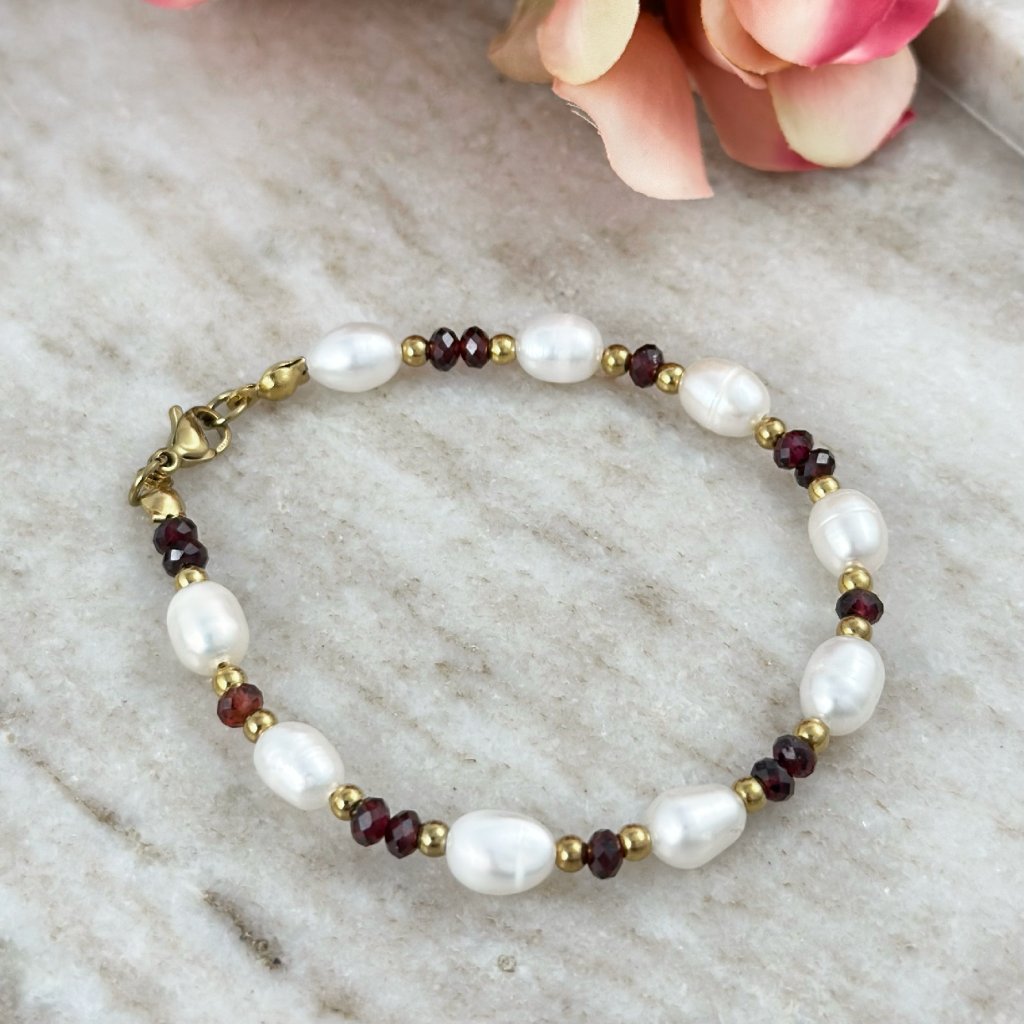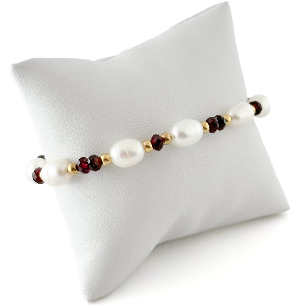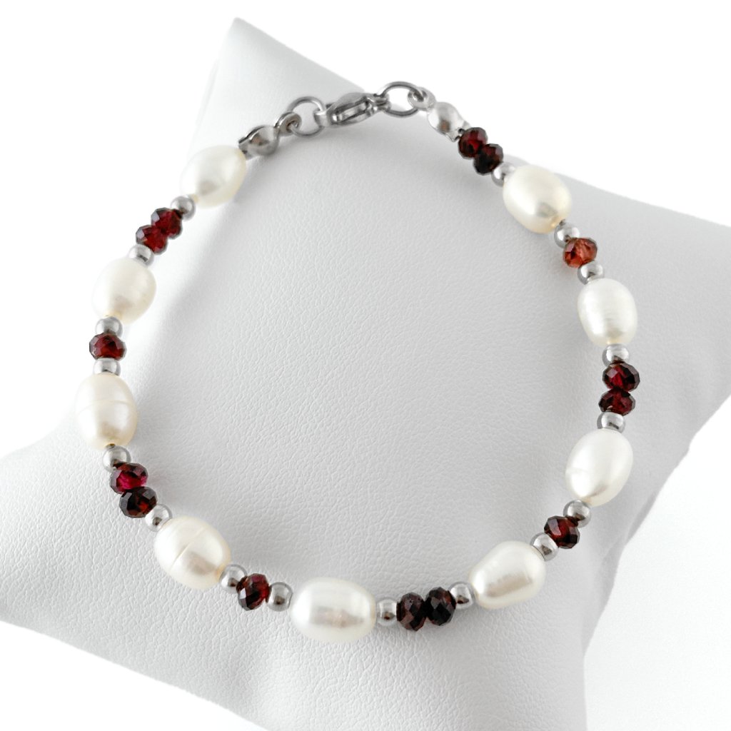Náramek s pravými říčními perlami a granátem. Jemný náramek z pravých říčních perel doplněný o vášnivý granát. Symbol čistoty a ženskosti s dotekem elegance – ideální doplněk pro výjimečné i každodenní chvíle.