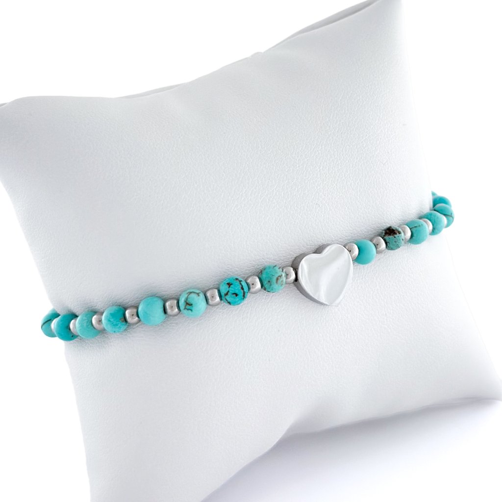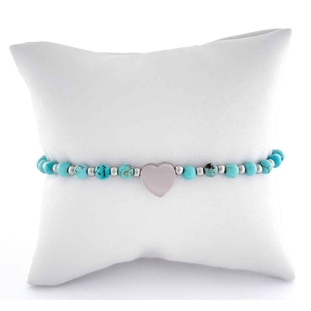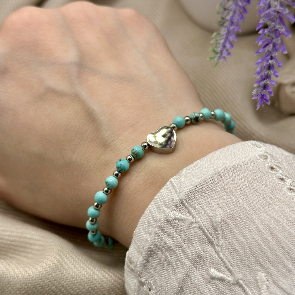 Náramek s tyrkysem. Tento nádherný náramek s tyrkysem a se srdíčkem zdobí kuličky rekonstruovaného tyrkysu. Ostatní části náramku jsou vyrobeny z kvalitní chirurgické oceli. Na náramku je umístěn i prodlužující řetízek, díky kterému se přizpůsobí každému zápěstí. V případě zájmu Vám upravím celkovou délku náramku na míru.