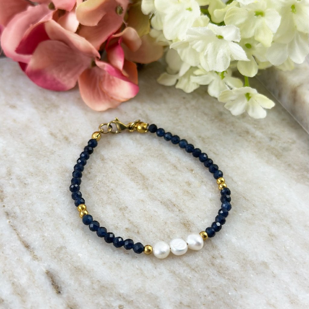 Přírodní safír dodává náramku hluboký odstín modři, symbolizující moudrost a vnitřní sílu. Jemné říční perly přinášejí harmonii, ženskost a půvab. Každý náramek se safírem je originál, vytvořený s pečlivostí a láskou k detailu.