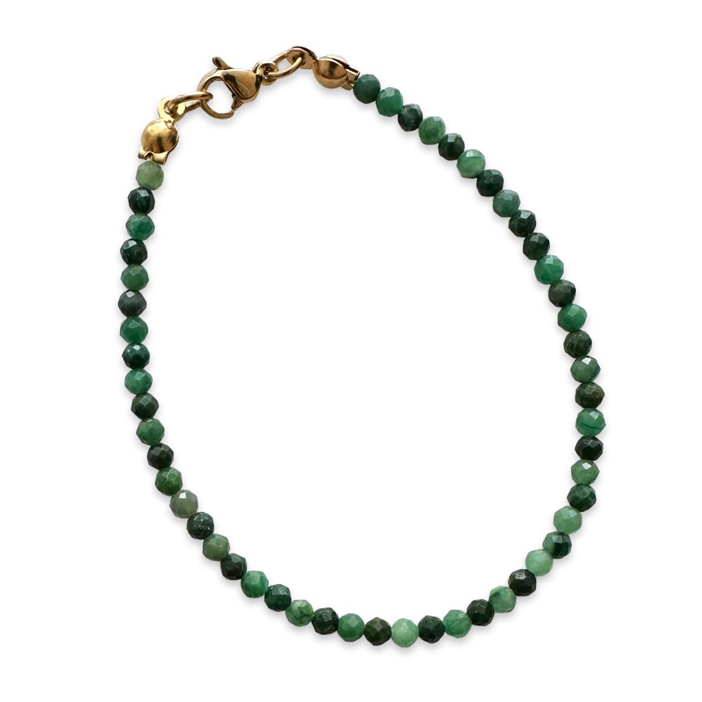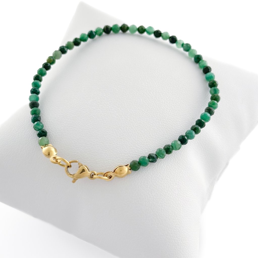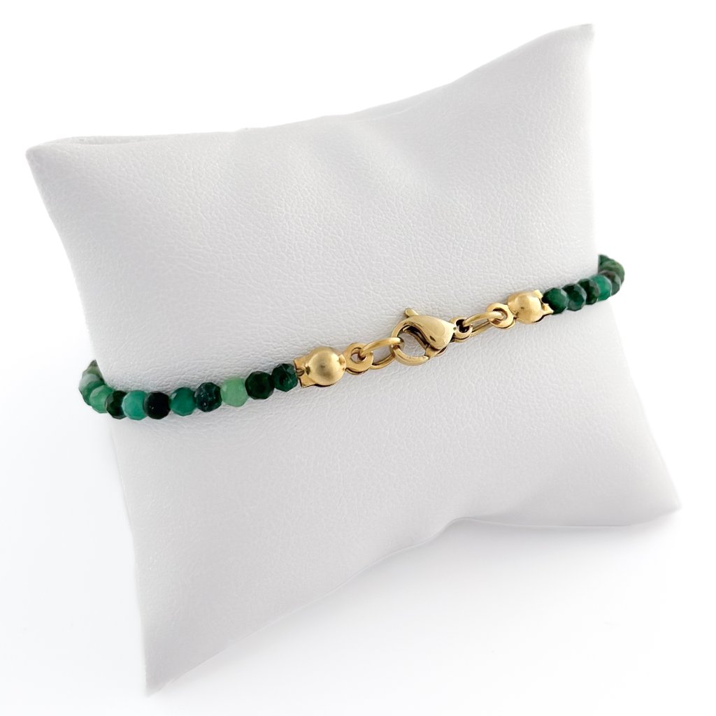 Náramek s přírodním smaragdem, který je minerálem rovnováhy. Smaragd pomáhá zklidnit mysl a podporuje fyzickou i duševní harmonii. Symbolizuje očistu a regeneraci. Náramek je vyroben na pevném ocelovém lanku, které zajišťuje jeho odolnost. Délku náramku se smaragdem Vám ráda upravím na míru. Možné zakoupit také ve výhodném setu s náušnicemi a náhrdelníkem.