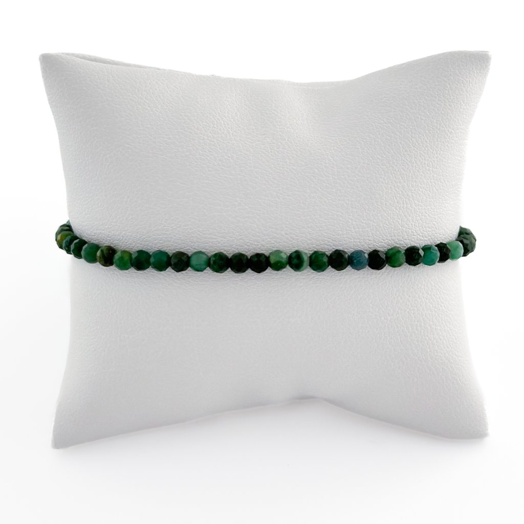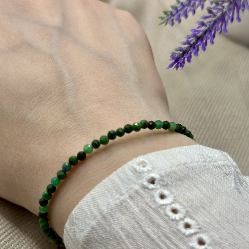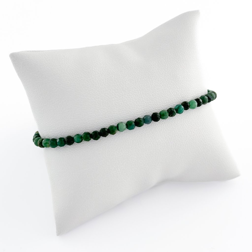 Náramek s přírodním smaragdem, který je minerálem rovnováhy. Smaragd pomáhá zklidnit mysl a podporuje fyzickou i duševní harmonii. Symbolizuje očistu a regeneraci. Náramek je vyroben na pevném ocelovém lanku, které zajišťuje jeho odolnost. Délku náramku se smaragdem Vám ráda upravím na míru. Možné zakoupit také ve výhodném setu s náušnicemi a náhrdelníkem.