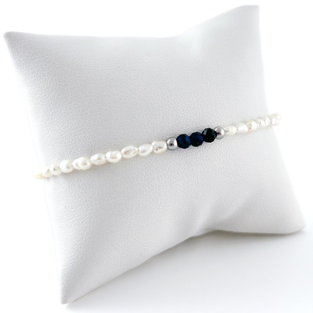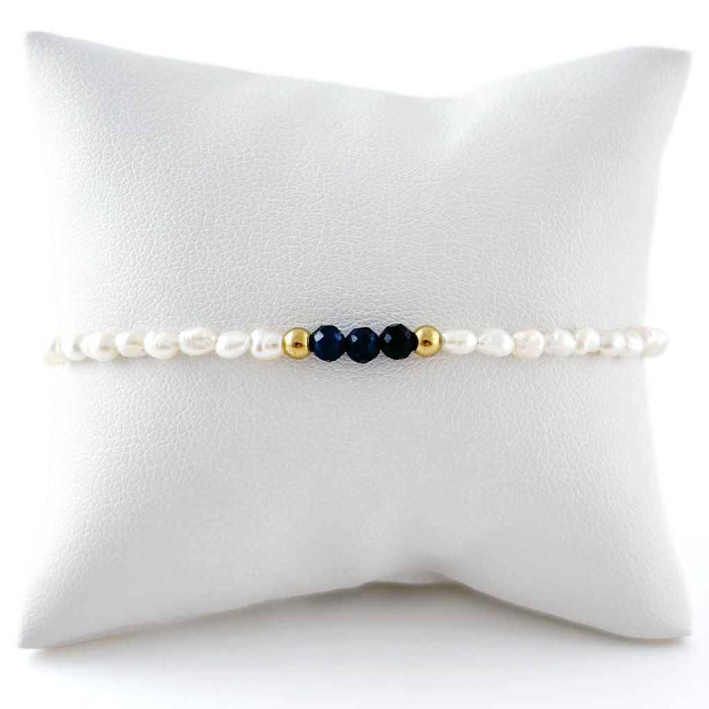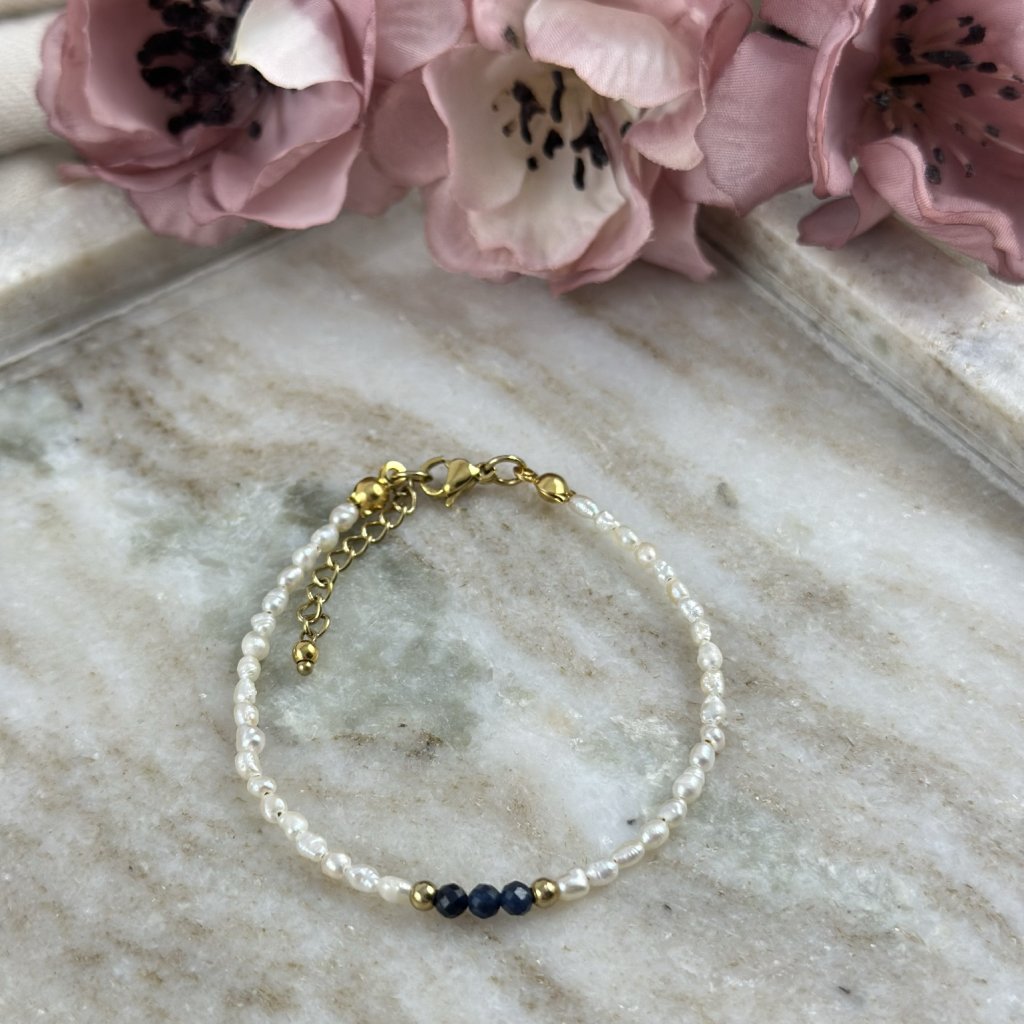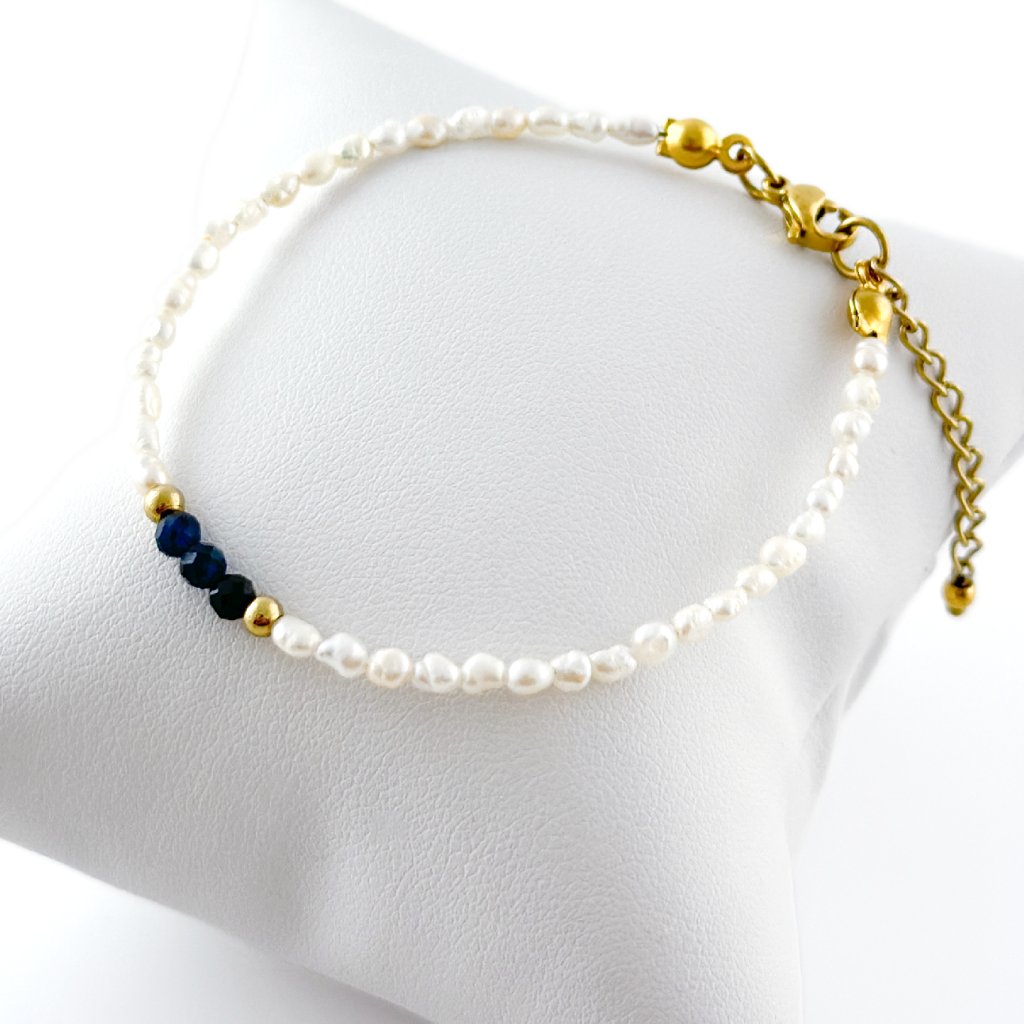 Ručně vyrobený náramek s pravými perlami a safírem. Perlový náramek spojuje eleganci pravých perel s krásou přírodního safíru, což vytváří dokonalý šperk pro každou příležitost. Perly přinášejí do náramku jemnost a sofistikovanost, zatímco safír dodává náramku hlubší význam a vyváženost.