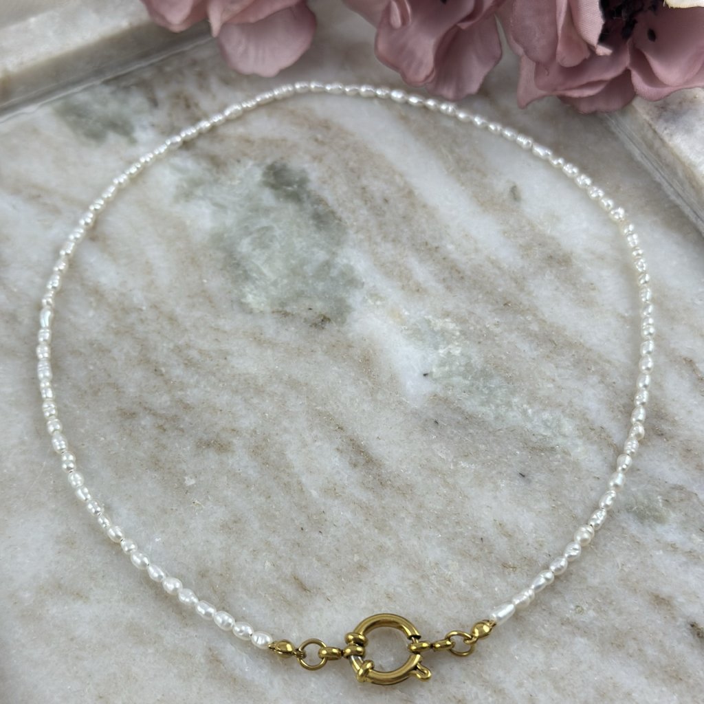 Náhrdelník z pravých perel Noemi. Perlový náhrdelník se svým minimalistickým vzhledem skvěle hodí ke kombinování s dalšími náhrdelníky. Na perlovém náhrdelníku je nápadité zapínání z přední strany. Celkovou délku perlového náhrdelníku Vám mohu upravit i na míru. Komponenty jsou vyrobeny z vysoce odolné chirurgické oceli, která je hypoalergenní.