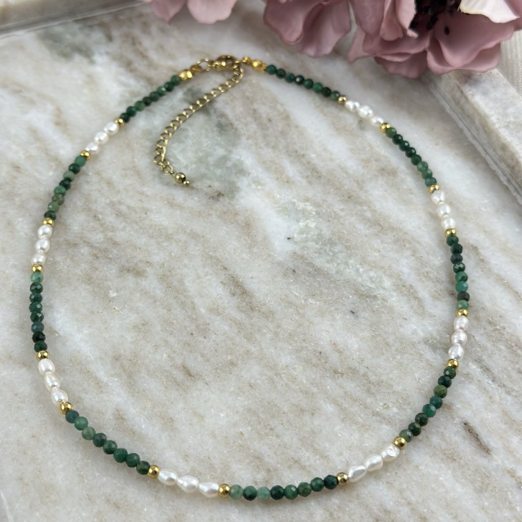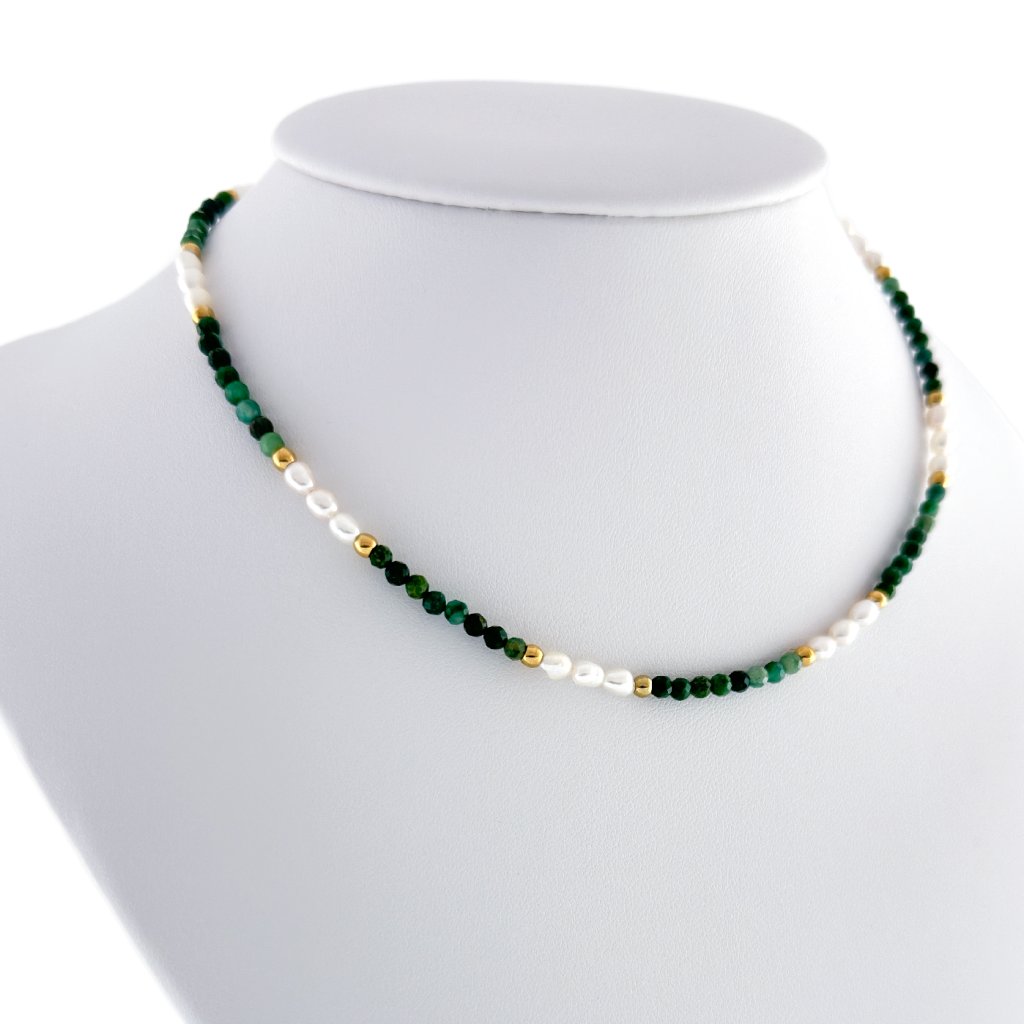 Ručně vyrobený náhrdelník se smaragdem a říčními perlami Julia. Propojení síly smaragdu jako symbolu obnovy a růstu, s něžností perel, které v sobě nesou klid a čistotu. Náhrdelník se smaragdem a říčními perlami Julia je oslavou jemnosti a elegance.
