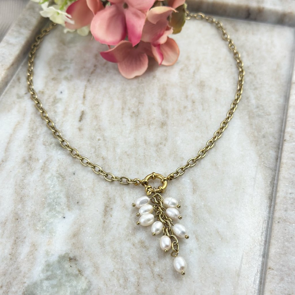 Řetízek s pravými perlami. Dodejte svému outfitu jemnou eleganci s tímto ručně vyráběným náhrdelníkem z kvalitní chirurgické oceli, doplněným o autentické pravé říční perly. Každá perla je originál – má svůj vlastní tvar, jemný lesk a přírodní nepravidelnosti, díky kterým je každý kus naprosto jedinečný. Chirurgická ocel je odolná, stálobarevná a vhodná i pro citlivou pokožku. Náhrdelník si tak zachová svůj vzhled po dlouhá léta, aniž by zčernal nebo způsobil podráždění. Řetízek je ozdoben několika pravými perlami, které vytvářejí sofistikovaný a současně minimalistický vzhled.