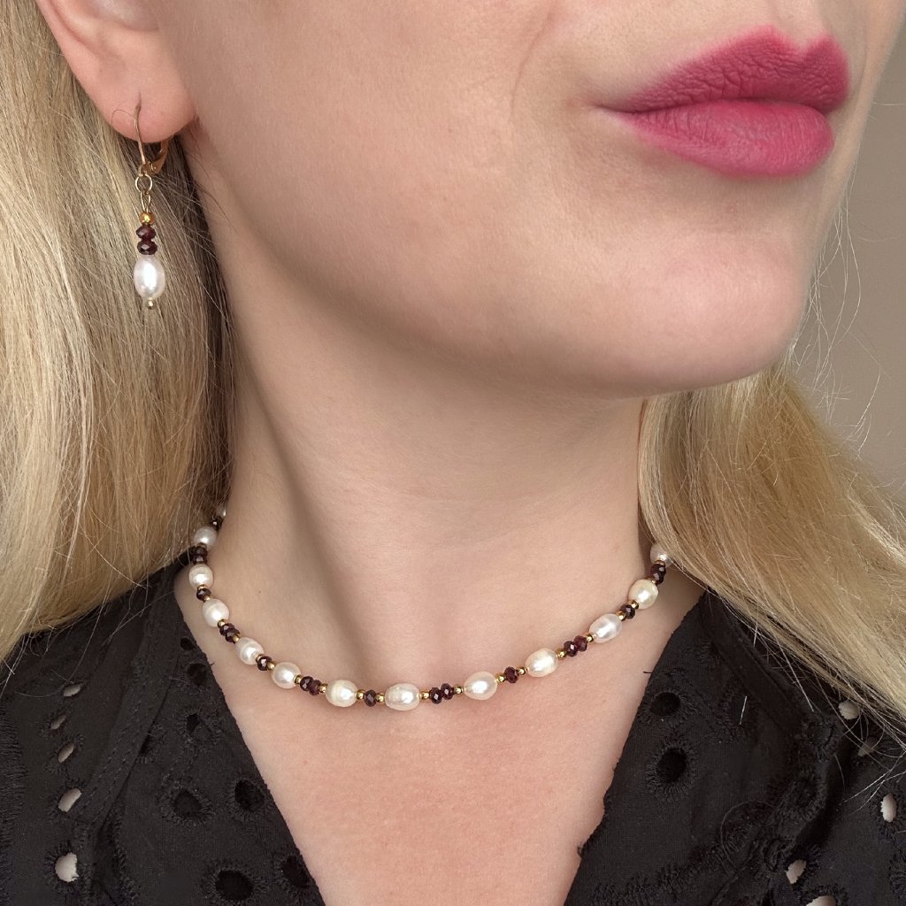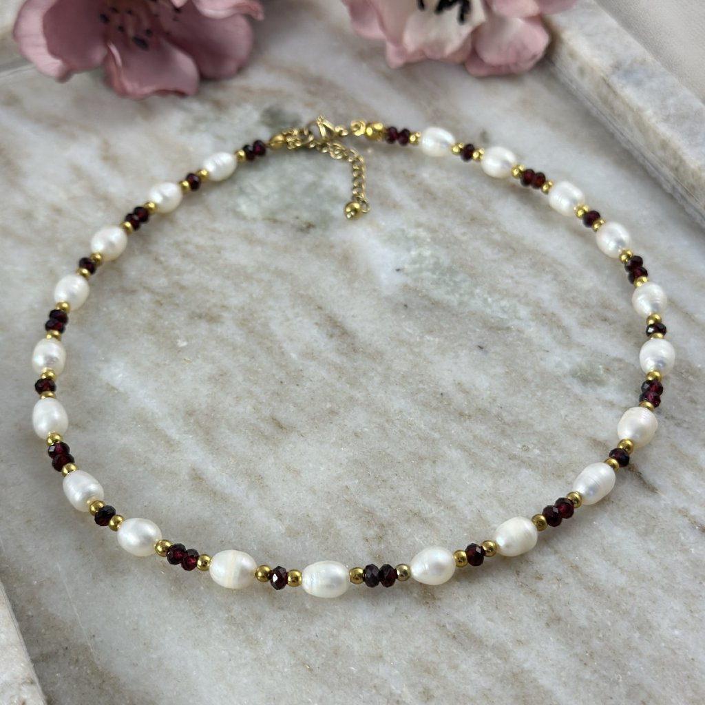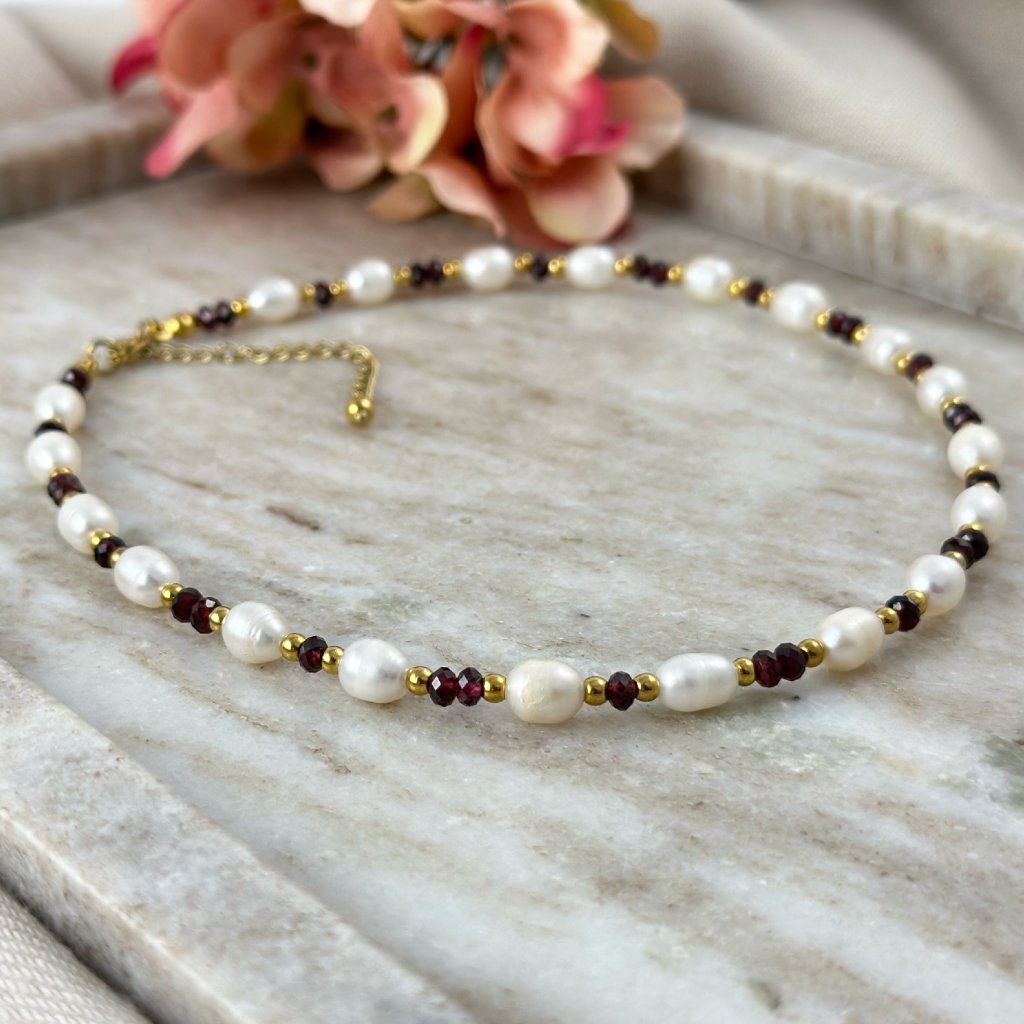 Náhrdelník s říčními perlami a granátem. Perlový náhrdelník Lana spojuje jemné říční perly s fascinujícím granátem, což vytváří elegantní a sofistikovaný klenot. Perly symbolizují čistotu a ženskost, zatímco granát přidává vášnivý a intenzivní nádech. Tento nadčasový náhrdelník s pravými perlami a granátem je ideální volbou pro každou ženu, která touží po jedinečném doplňku, který podtrhne její přirozenou krásu.