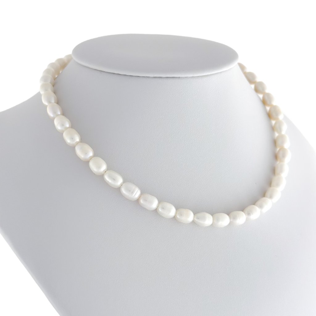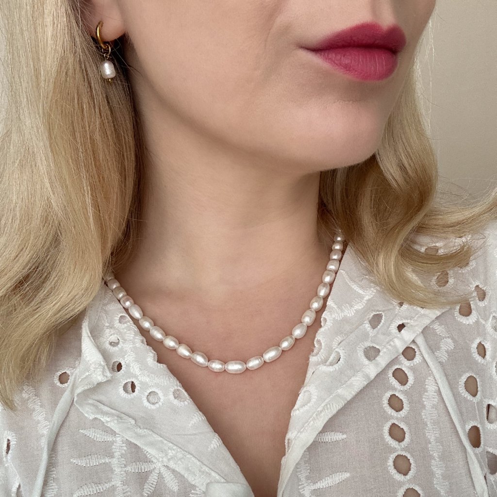 Náhrdelník z pravých říčních perel Teresa Vás okouzlí svým čistým vzhledem. Náhrdelník z perel zdobí nádherné říční perly vysoké kvality velikosti 5-6 mm. Perly jsou luxusní a nadčasové a nikdy s nimi neuděláte chybu. Ať už náhrdelník z říčních perel vynesete na večírek nebo jen tak k jednoduchému outfitu, vždy budete vypadat skvěle. Ostatní komponenty jsou z vysoce odolné chirurgické oceli, která je hypoalergenní a nečerná ani po kontaktu s vodou. Vyrobím Vám perlový náhrdelník i na míru.