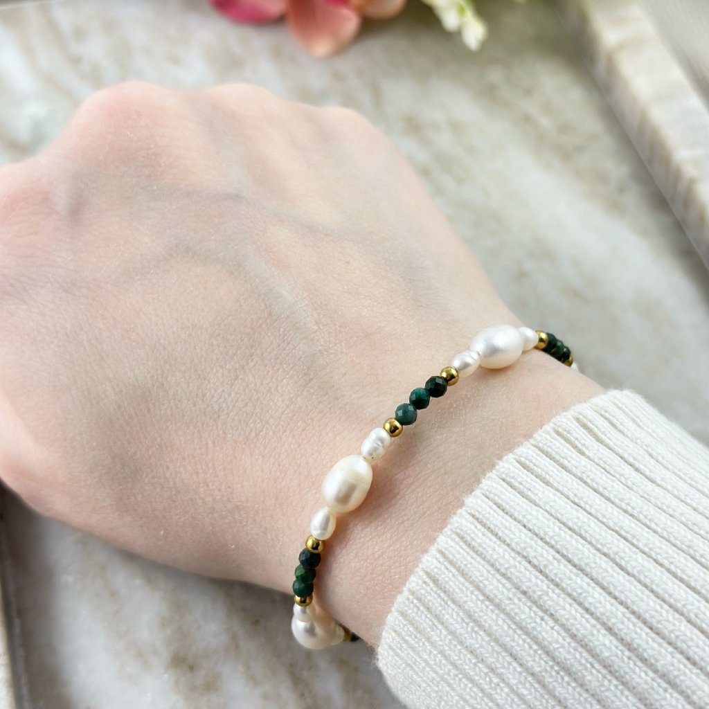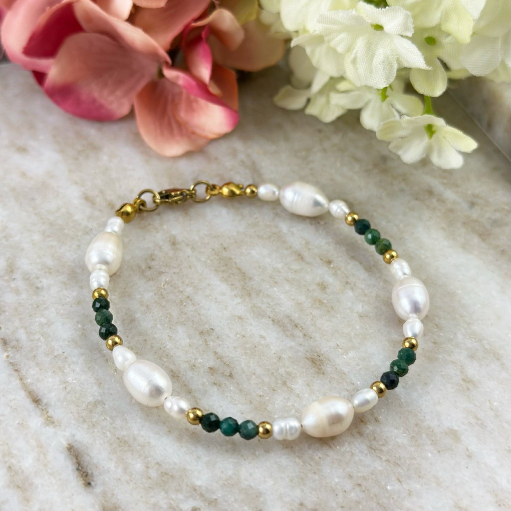 Ručně vyrobený náramek se smaragdem a říčními perlami Carmen. Divoká krása přírody a její síla, kterou v sobě skrývá se odráží v tomto náramku. Jemné říční perly, jako kapky vody z klidného jezera, obklopují smaragd a dodávají náramku jemnost a harmonii. Ve stejném stylu lze zakoupit i náhrdelník Carmen.