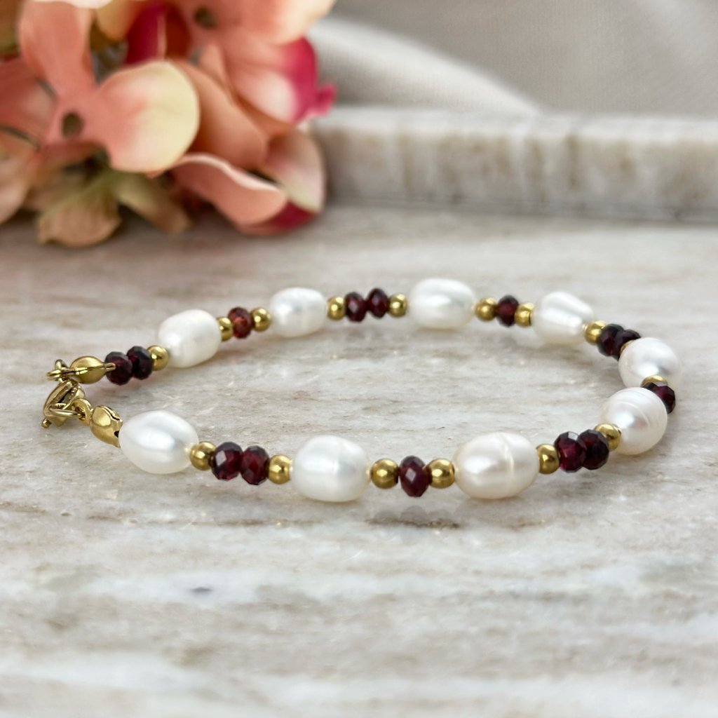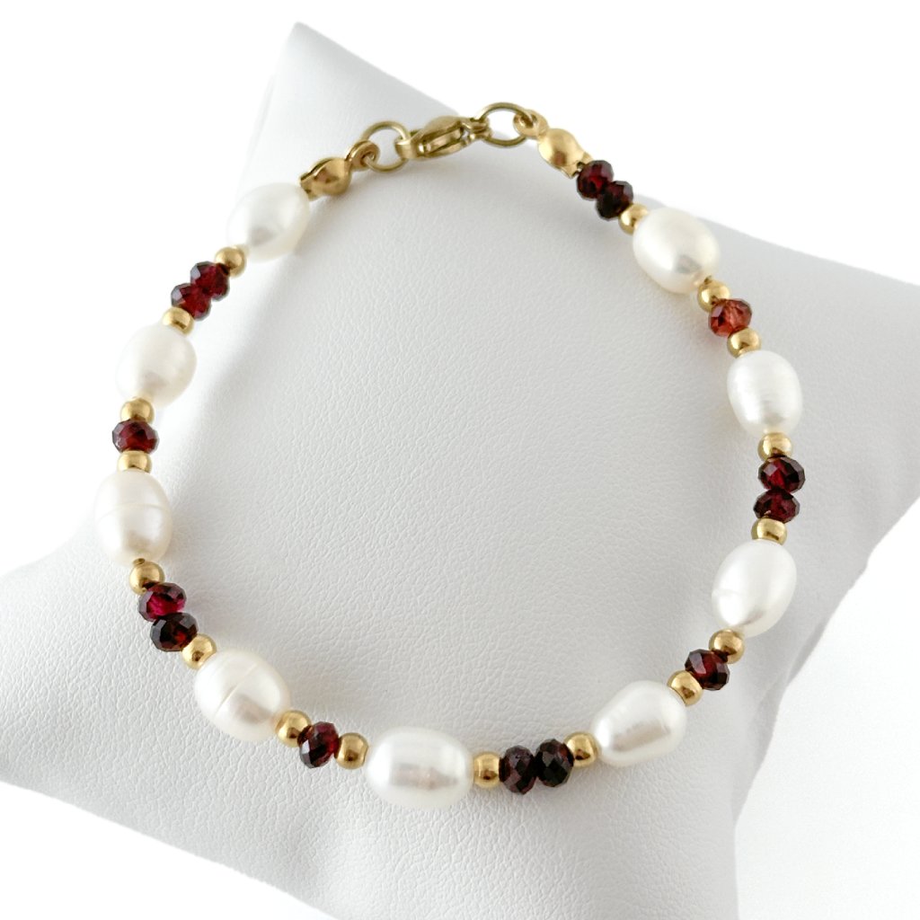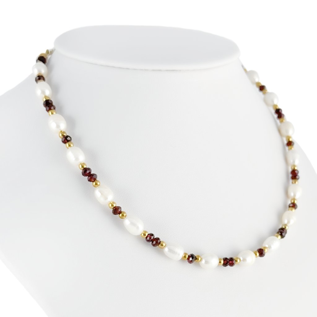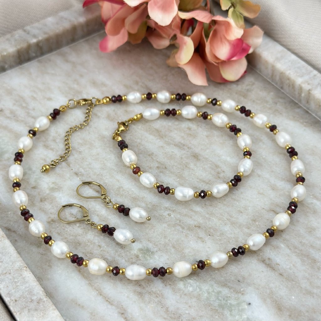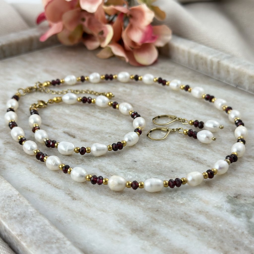Souprava šperků s pravými perlami a granátem. Nádherný a výhodný set obsahující náhrdelník choker, náramek a náušnice. Celý set je zdoben přírodním granátem a pravými sladkovodními perlami. Na náhrdelník je napojen prodlužující řetízek. Komponenty jsou vyrobeny z chirurgické oceli. Délku náhrdelníku a náramku Vám ráda upravím na míru.