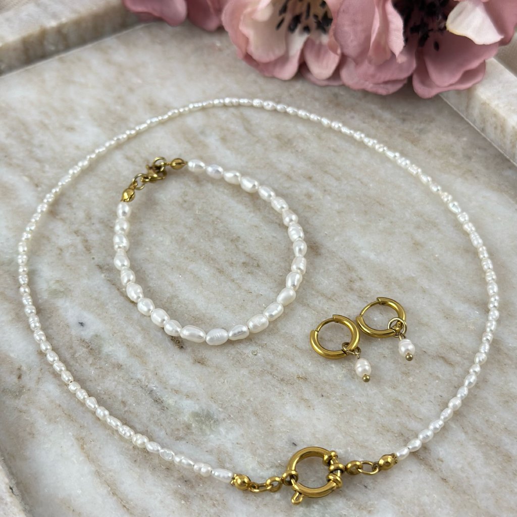 Souprava šperků s říčními perlami. Výhodný set Noemi obsahuje náušnice, náhrdelník a náramek. Náhrdelník a náramek jsou zdobeny pravými sladkovodními perlami vysoké kvality. Kroužkové náušnice zdobí jedna perla. Náušnice a ostatní komponenty jsou vyrobeny z chirurgické oceli, která je hypoalergenní a nečerná. Možné zakoupit i každý kousek zvlášť. K dispozici ve stříbrné i zlaté variantě. V případě zájmu Vám upravím délku náhrdelníku a náramku na míru.