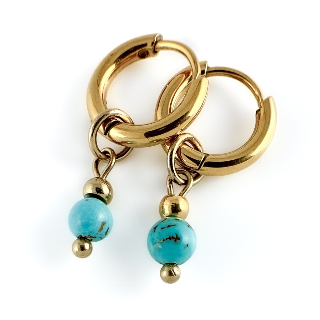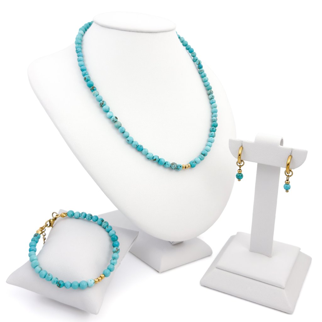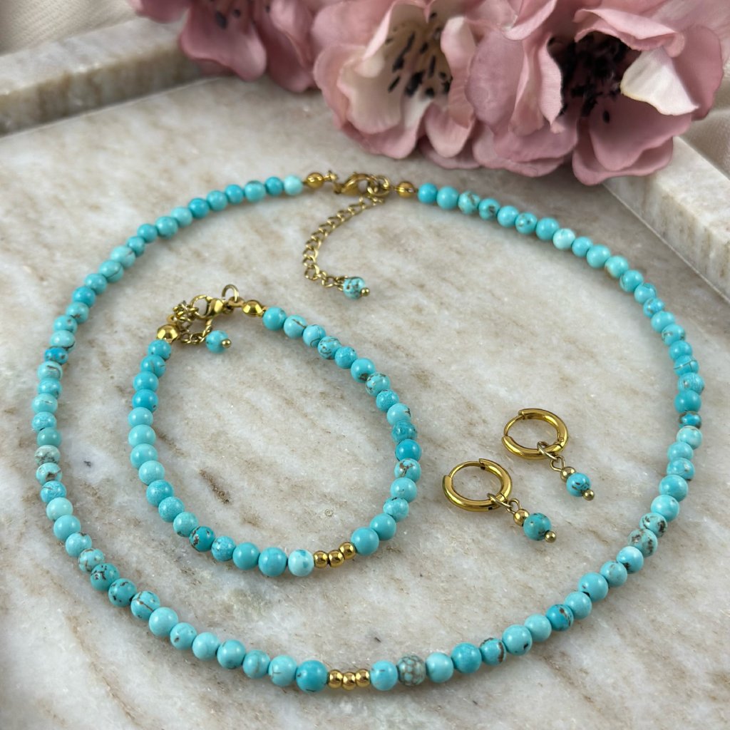 Souprava šperků z tyrkysu. Nádherný set Valentino z rekonstruovaného tyrkysu. Doplněno o zlaté korálky z hypoalergenní chirurgické oceli. Na náhrdelník a náramek je napojen prodlužující řetízek, díky kterému si krásně přizpůsobíte velikost. Náušnice jsou rovněž vyrobeny z chirurgické oceli, takže se nemusíte bát, že by Vás z nich bolely uši. Náhrdelník i náramek Vám upravím i na míru. K dispozici ve stříbrném i zlatém provedení.