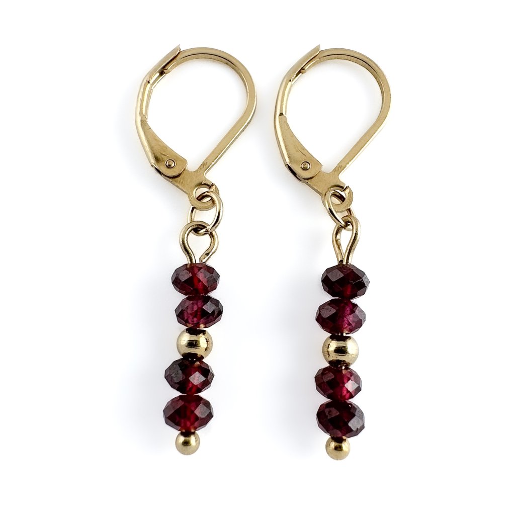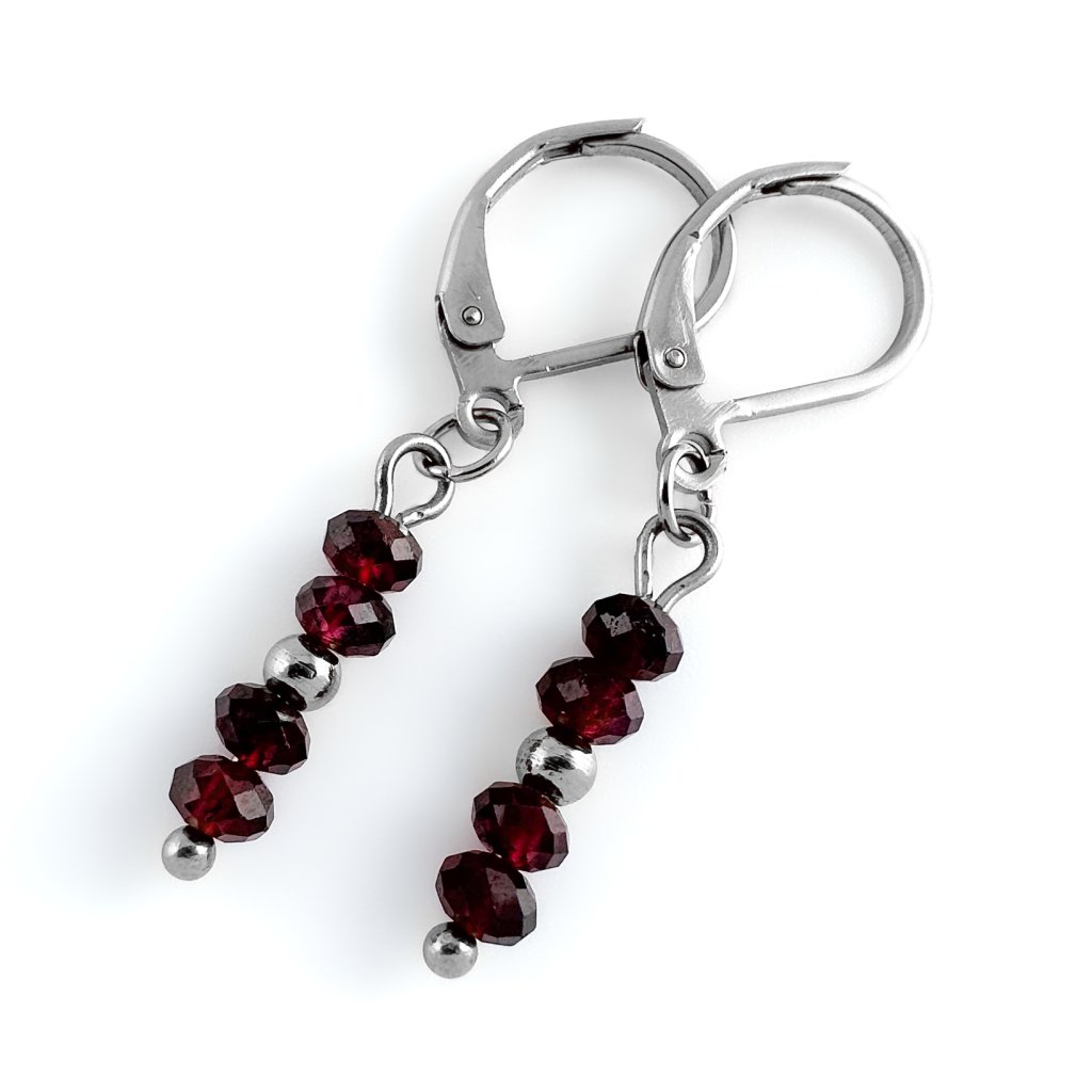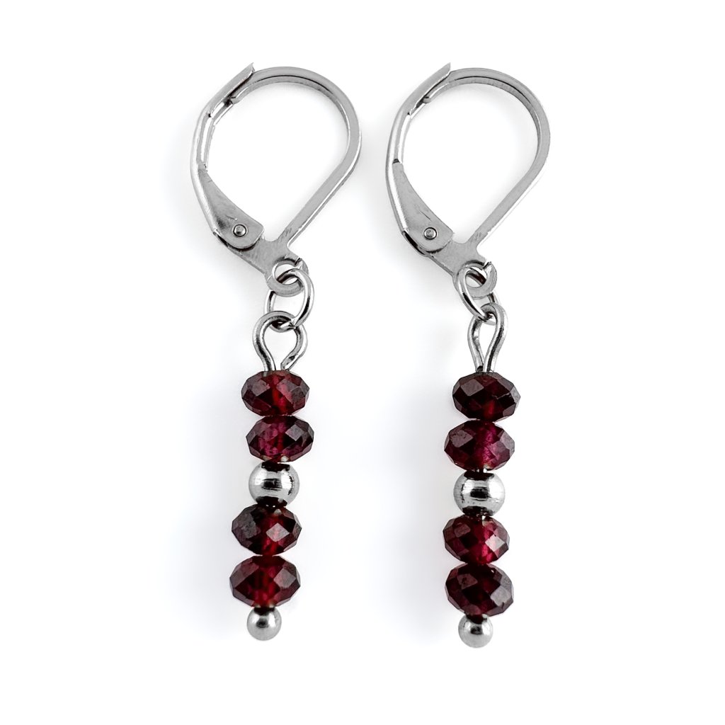 Visací náušnice s granátem. Granát je minerál, který podporuje sílu a odhodlání. Také dodává životní energii a vytrvalost.