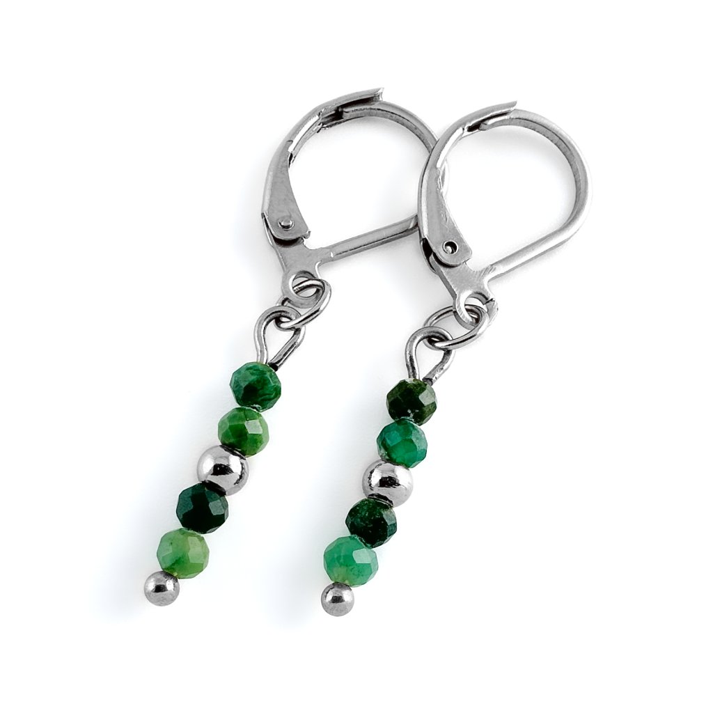 Smaragdové náušnice. Smaragd je minerál, který podporuje rovnováhu. Zklidňuje mysl a zajišťuje fyzickou a duševní rovnováhu. Je symbolem očisty a regenerace. Visací náušnice se smaragdem jsou vyrobeny z antialergenní chirurgické oceli. Tyto zelené náušnice se hodí na běžné nošení, ale i na speciální příležitost.