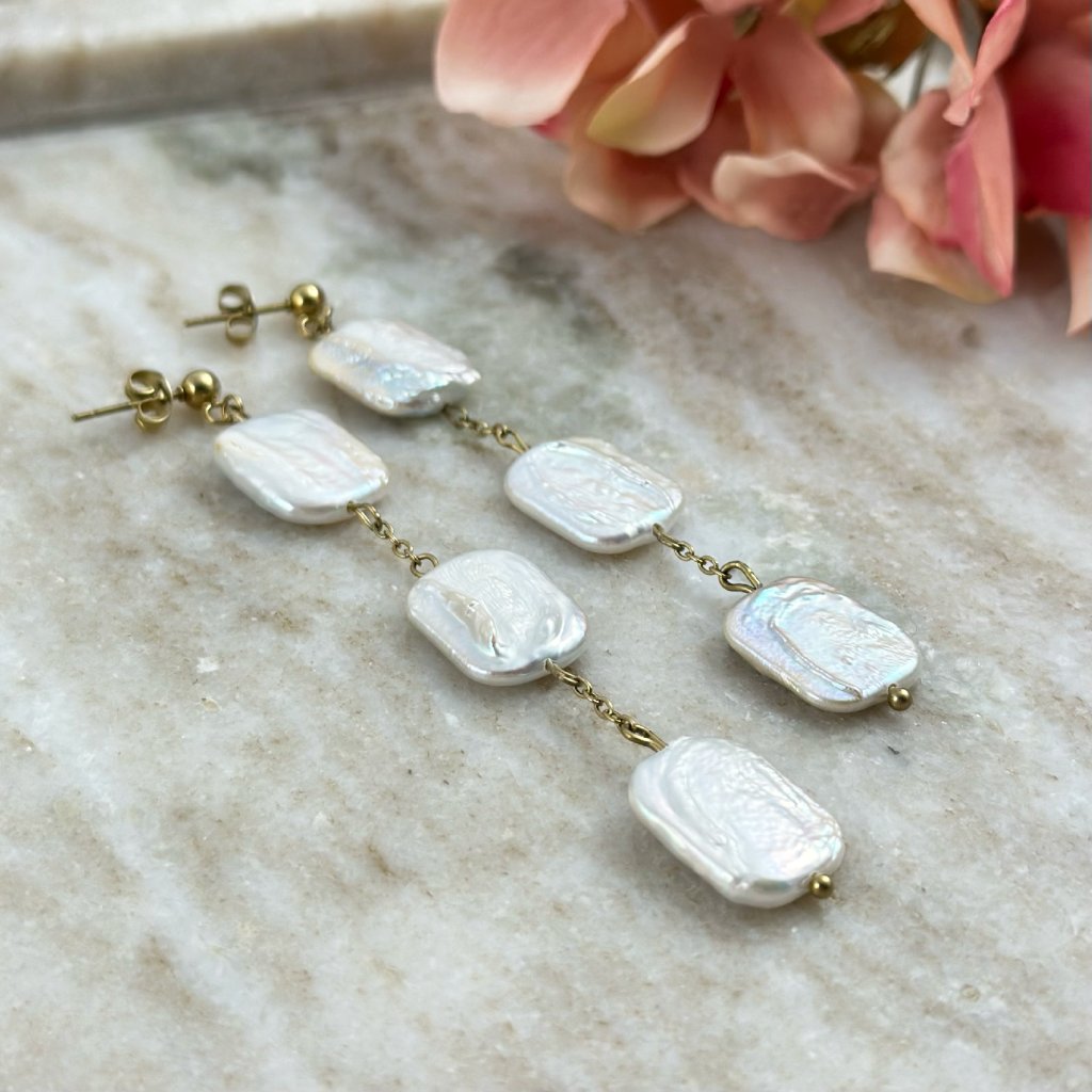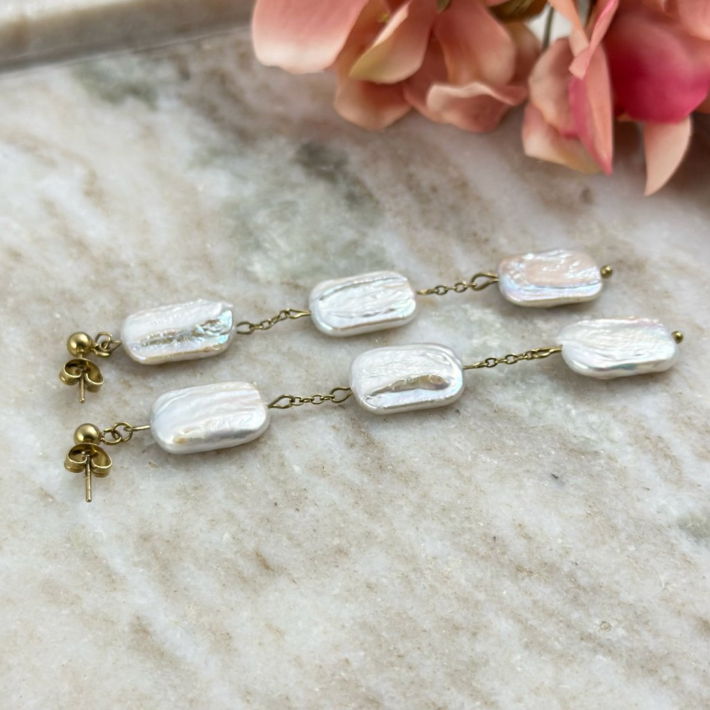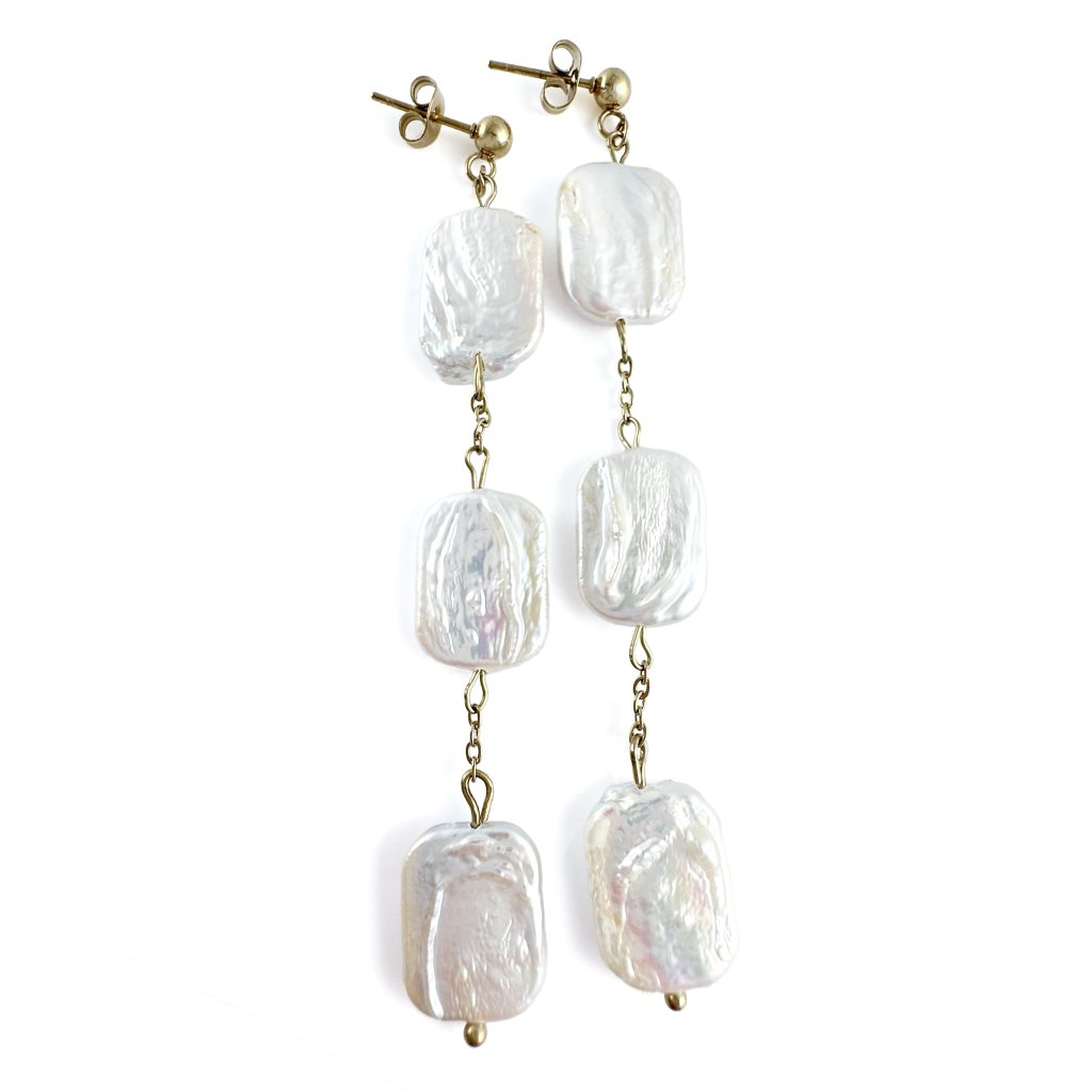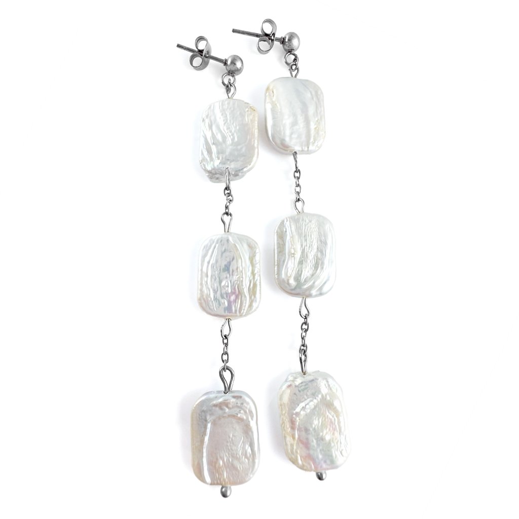 Visací náušnice s pravými barokními perlami. Elegantní visací náušnice s třemi pravými barokními perlami představují dokonalé spojení luxusu a originality. Nepravidelný tvar každé perly zajišťuje, že každý pár náušnic je naprostý originál. Tři perly zavěšené v jemné linii vytvářejí pohyblivý, ladný efekt, který podtrhne vaši ženskost a styl.