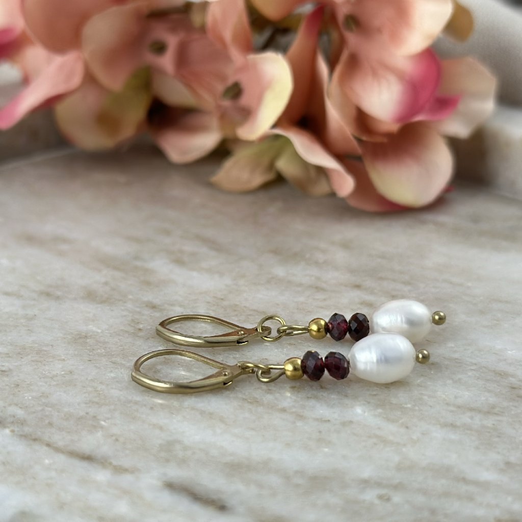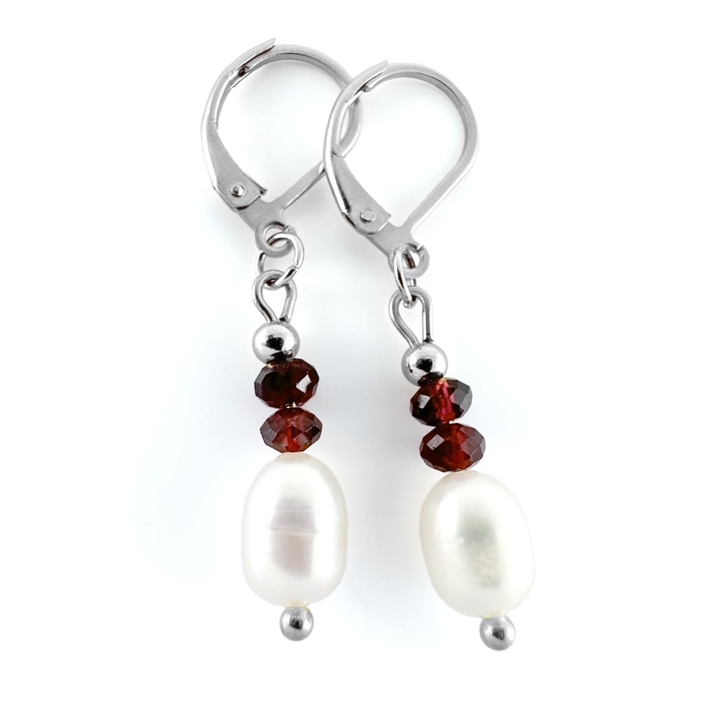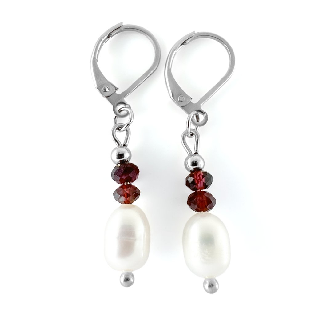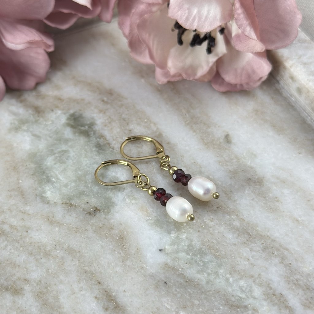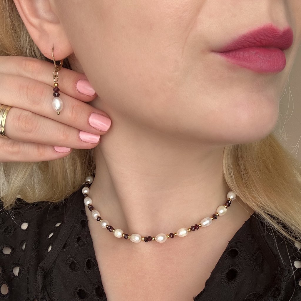 Visací náušnice s říční perlou a granátem. Objevte kouzlo perel a granátů v těchto elegantních visacích náušnicích. Perly přinášejí do náušnic jemnost a čistotu, zatímco granáty dodávají nádech vášnivé intenzity. Perfektní volba pro každodenní nošení i speciální příležitosti.