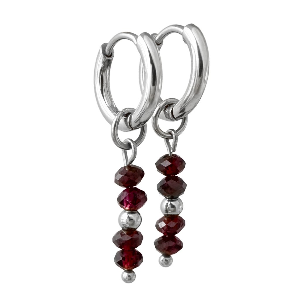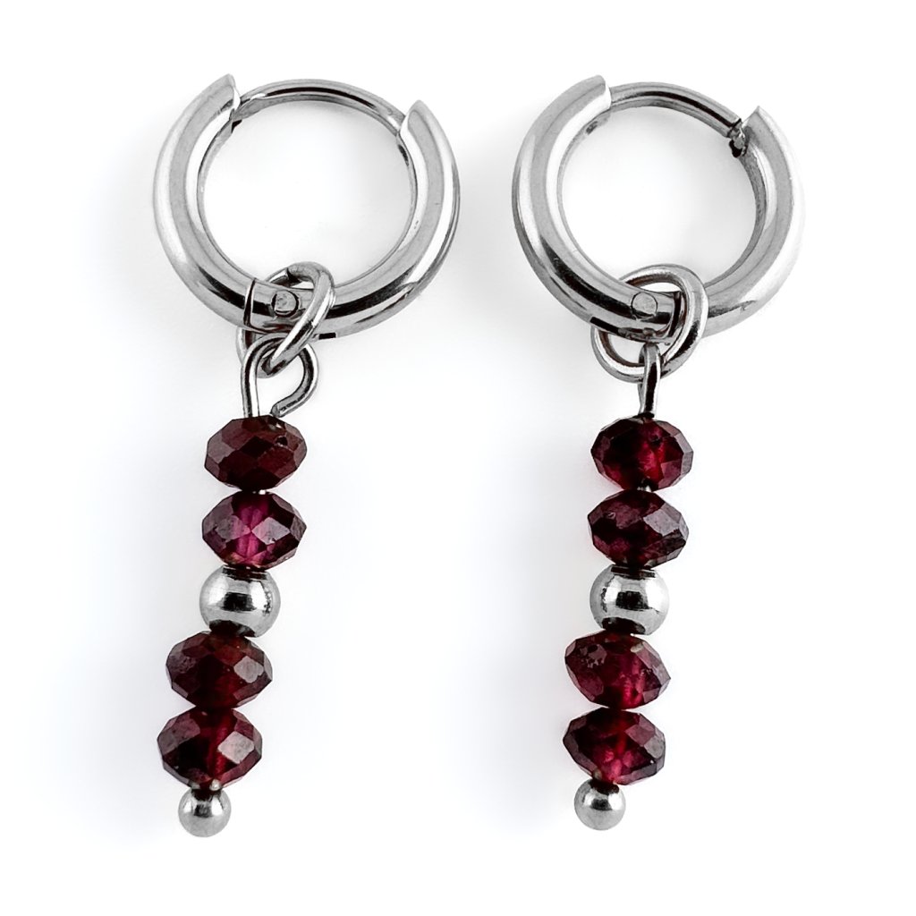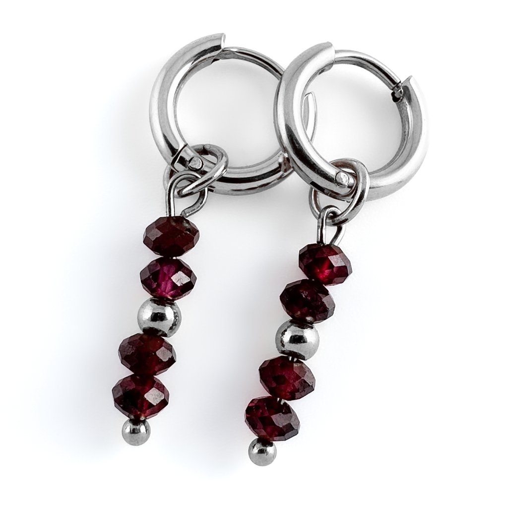 Náušnice s granáty. Ručně vyrobené náušnice z chirurgické oceli, které zdobí korálky z přírodního granátu. Granát je minerál, který podporuje sílu a odhodlání. Také dodává životní energii a vytrvalost. Tyto červené náušnice s přírodním granátem se dají skvěle kombinovat s náhrdelníky a s náramky v nabídce. Při objednání si můžete vybrat ze tří velikostí kroužků. Skvěle se hodí i jako dárek.
