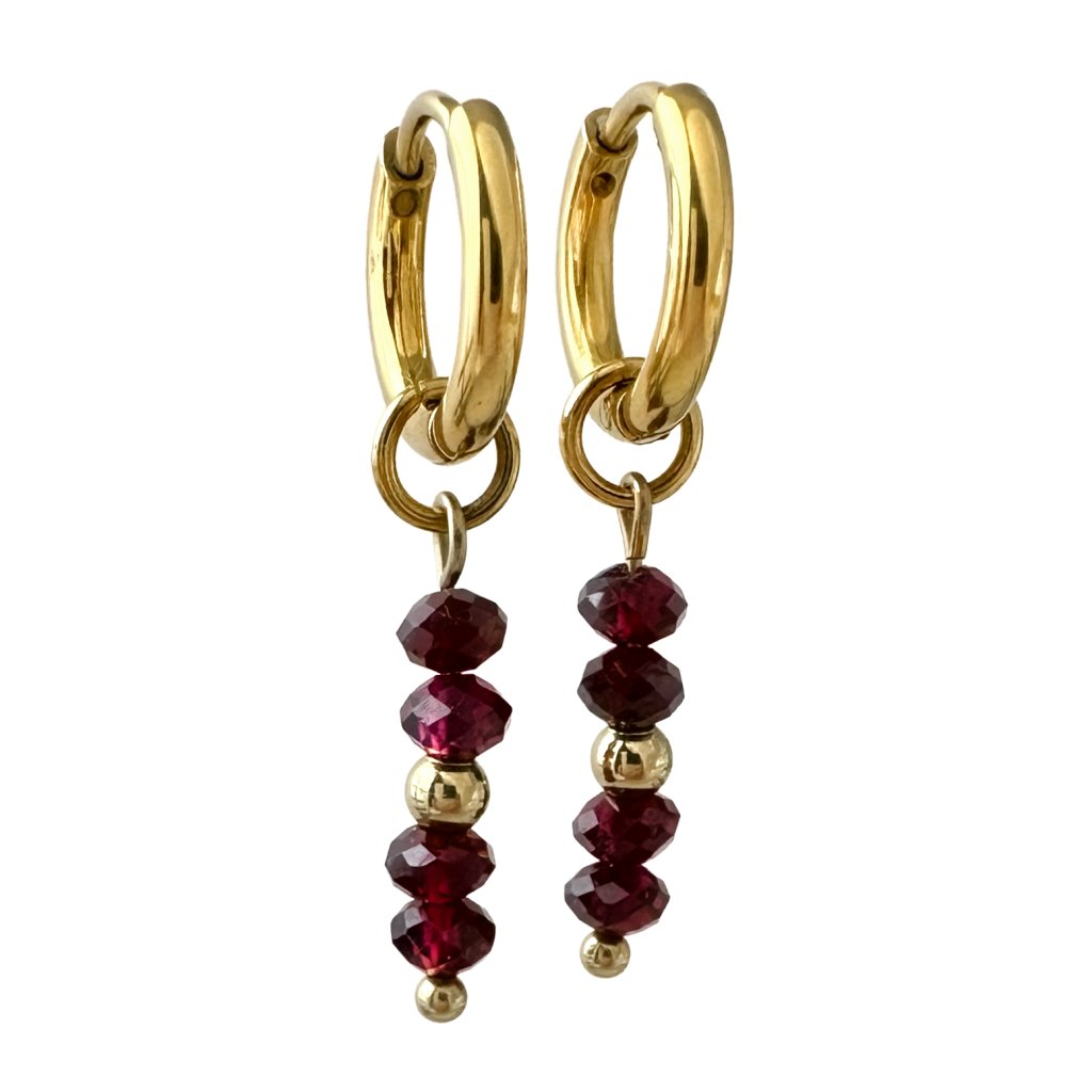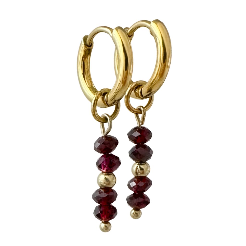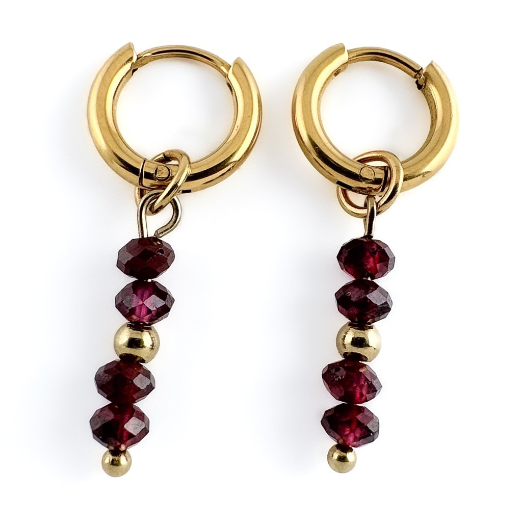 Náušnice s granáty. Ručně vyrobené náušnice z chirurgické oceli, které zdobí korálky z přírodního granátu. Granát je minerál, který podporuje sílu a odhodlání. Také dodává životní energii a vytrvalost. Tyto červené náušnice s přírodním granátem se dají skvěle kombinovat s náhrdelníky a s náramky v nabídce. Při objednání si můžete vybrat ze tří velikostí kroužků. Skvěle se hodí i jako dárek.