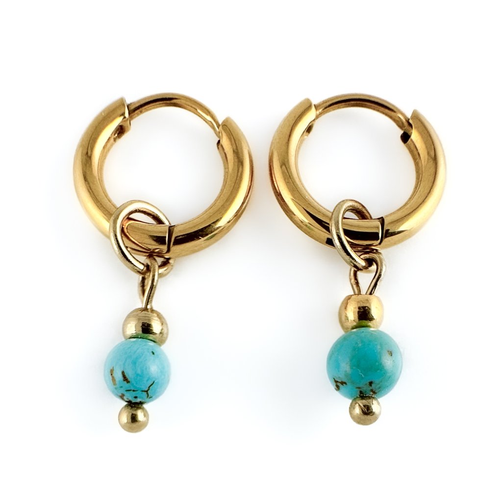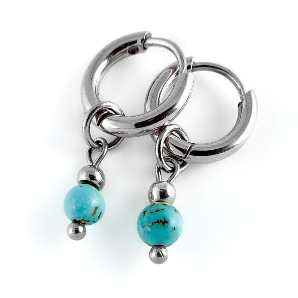 Tyrkysové náušnice. Náušnice Valentino zdobí korálky z rekonstruovaného tyrkysu. Materiál kruhové náušnice je z vysoce odolné chirurgické oceli, která je hypoalergenní. Náušnice Valentino se hodí na běžné nošení, ale i k večernímu outfitu. Tyto modré náušnice se skvěle hodí i jako dárek. Tyto kruhové náušnice s tyrkysem jsou k dispozici i ve výhodném setu s náramkem a náhrdelníkem. Nabízím rovněž i ve stříbrném provedení.