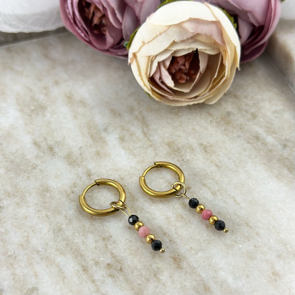 Kruhové náušnice se spinelem a rodonitem. Tyto náušnice kruhy spojují hluboký lesk černého spinelu s jemnou něžností růžového rodonitu. Kontrast tmavého a růžového kamene vytváří jedinečný a nepřehlédnutelný šperk, který dokonale podtrhne ženskost a osobitý styl své nositelky. Černý spinel je symbolem ochrany a vnitřní síly, zatímco rodonit přináší lásku, klid a harmonii.