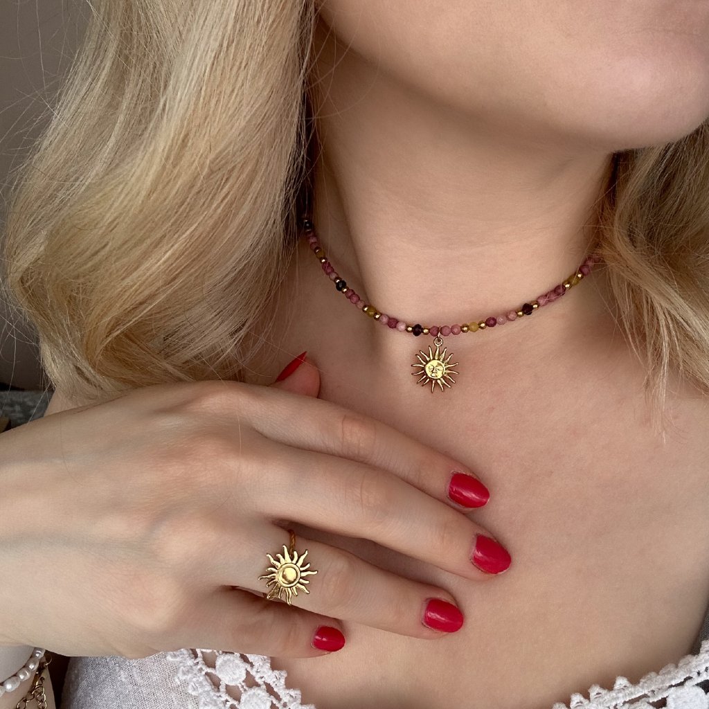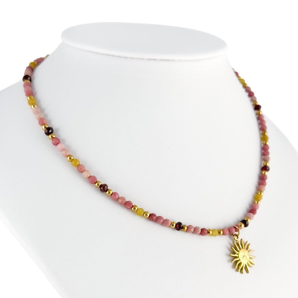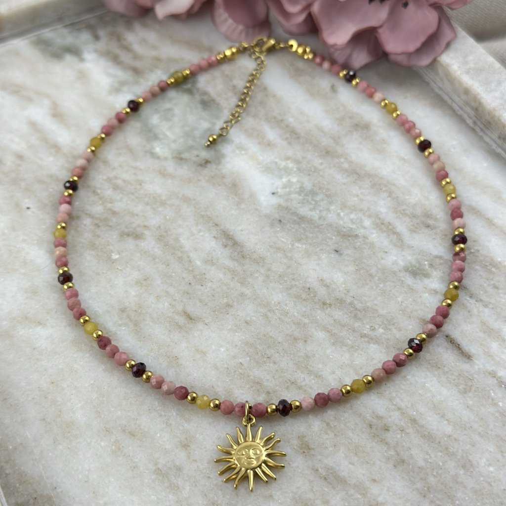 Choker z přírodních minerálů s přívěskem slunce – energie, vášeň a harmonie. Nechte se unést sílou přírody s tímto jedinečným chokerem, který spojuje krásu přírodních minerálů s hlubokou symbolikou slunce. Kombinace rodonitu, granátu a citrínu vytváří harmonický celek plný energie a elegance. Rodonit přináší rovnováhu a lásku, granát probouzí vášeň a odvahu, zatímco citrín září optimismem a radostí. Zlatý přívěsek slunce je symbolem síly, světla a pozitivní energie.