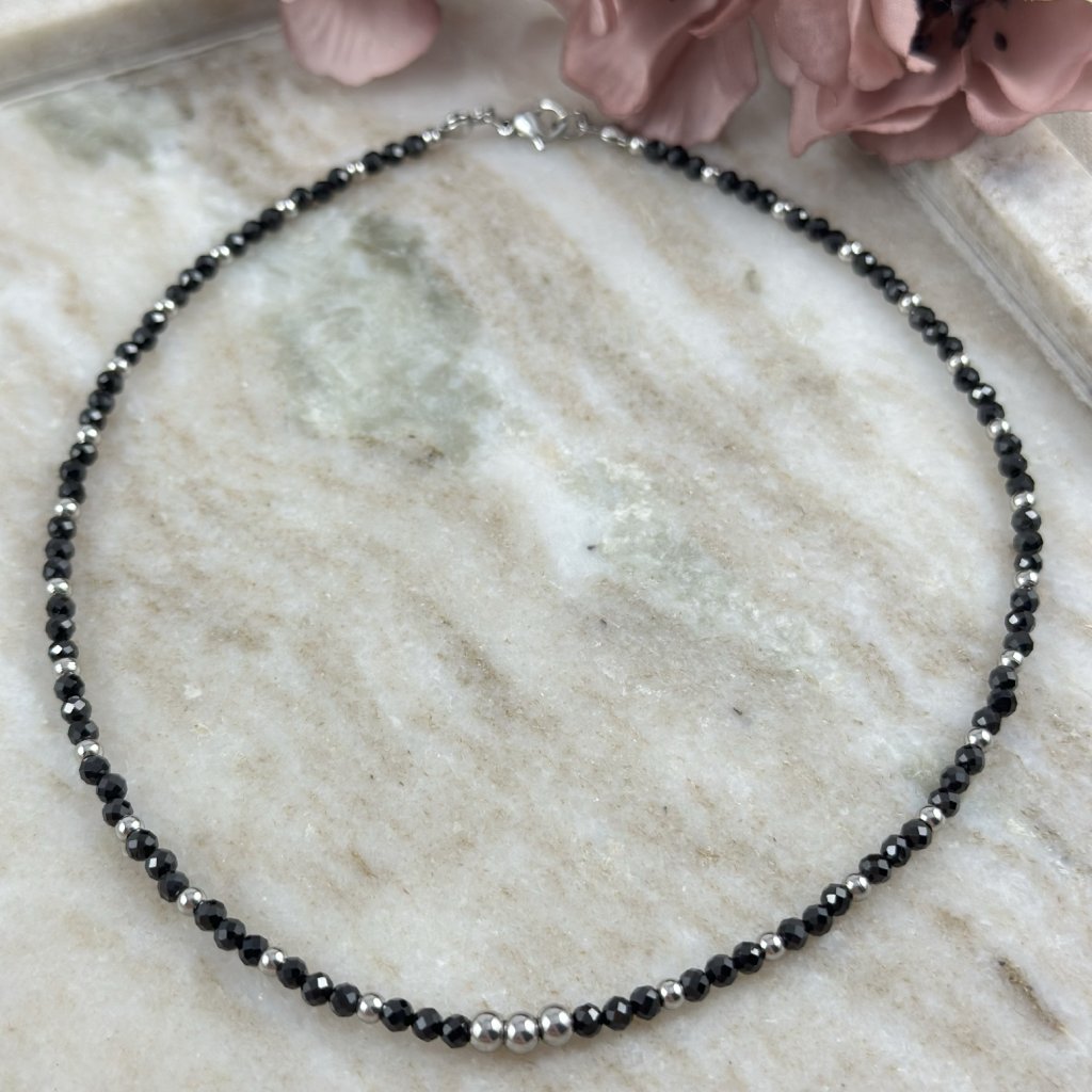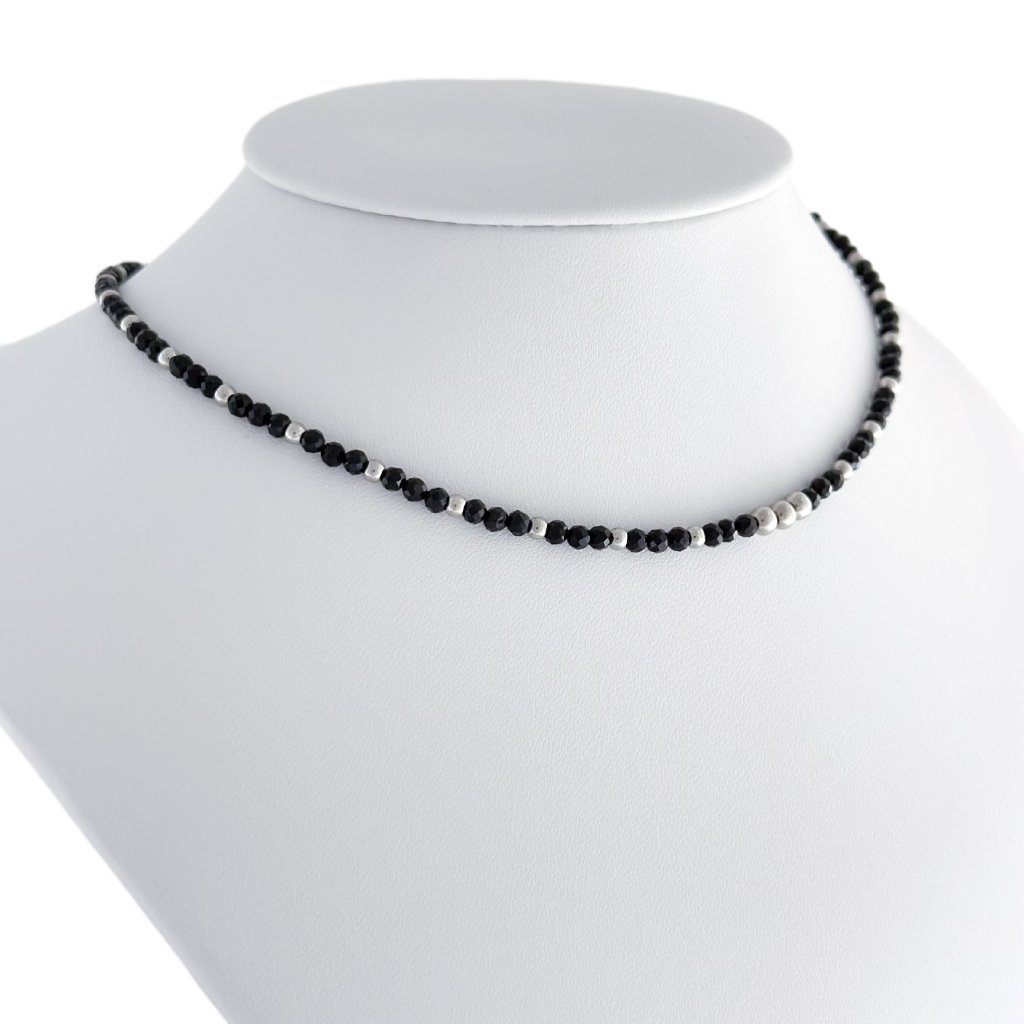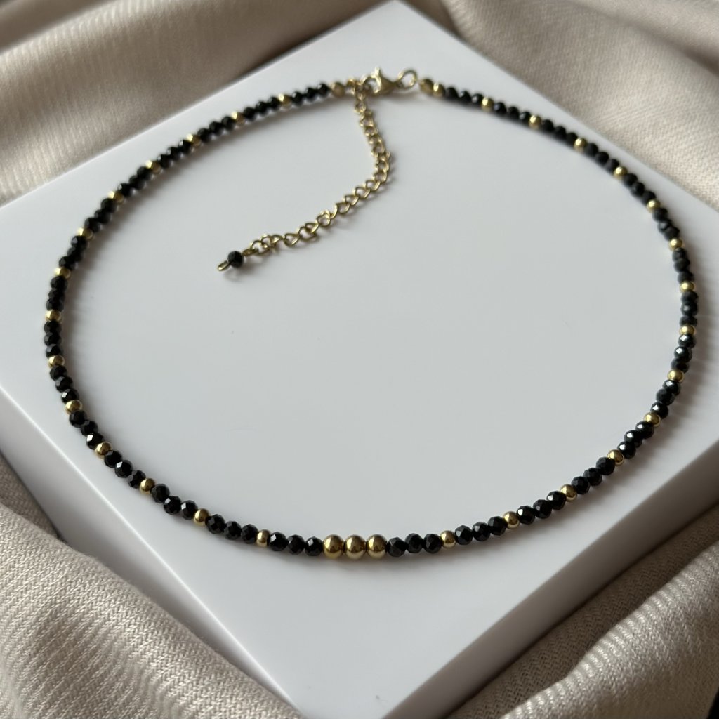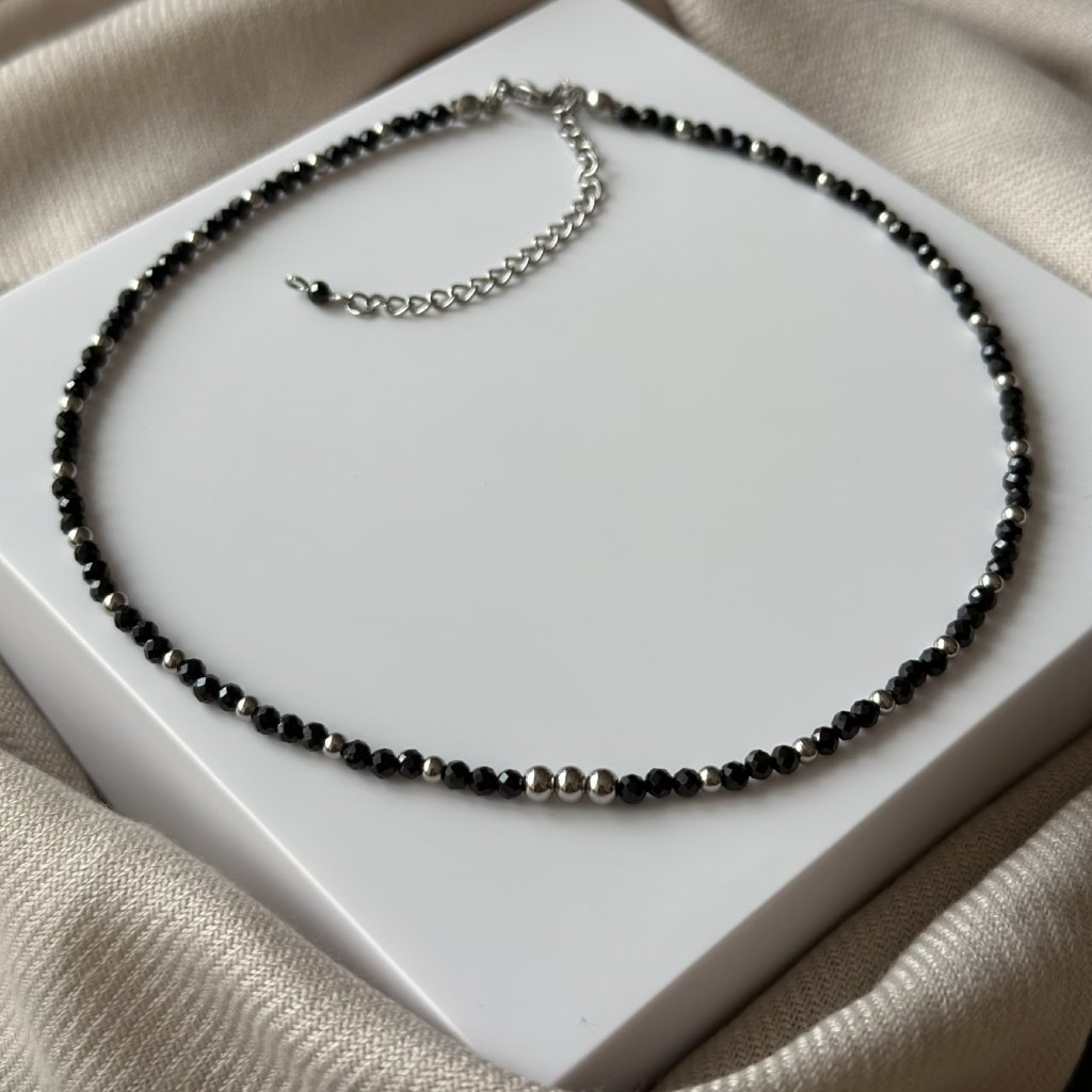 Ručně vyrobený choker náhrdelník s přírodním spinelem. Náhrdelník s černým spinelem nejen krásně září, ale také pohlcuje negativní energii a pomáhá udržovat duševní rovnováhu. Spinel, často označovaný jako korund, má nádherný třpyt a dodává náhrdelníku výjimečný lesk.