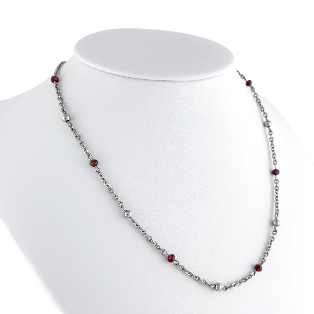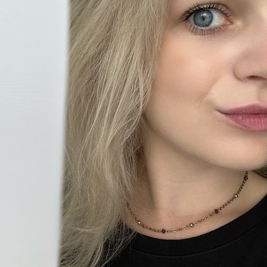Jedinečný náhrdelník s granátem Luna – ručně vyrobený šperk, který v sobě nese příběh vášně a tajemství. Každý detail náhrdelníku Luna byl vytvořen s láskou a péčí. Je odrazem klidu měsíční noci. Tento řetízek s přírodním granátem bude vašim talismanem, který vám připomene, že i v nejtemnější noci září světlo, a že v každém z nás je síla tvořit svou vlastní cestu. Možnost úpravy náhrdelníku na míru.