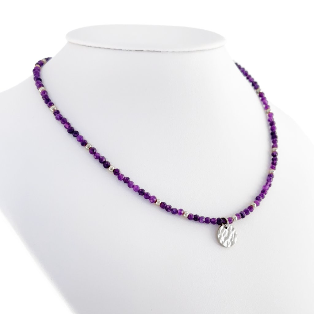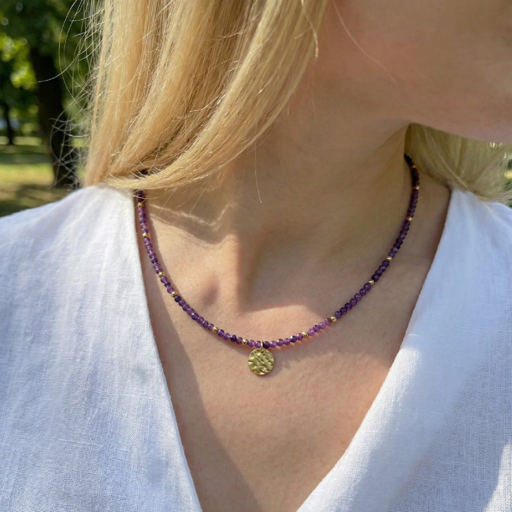 Náhrdelník s ametystem Aurelia. Objevte krásu a sílu přírody s tímto ručně vyráběným náhrdelníkem z pravého ametystu. Každý kámen byl pečlivě vybrán a navlečen s láskou, aby vznikl elegantní a zároveň silně energetický šperk. Ametyst je známý jako kámen klidu, intuice a duchovní očisty. Pomáhá tišit mysl, zmírňuje stres a napětí, podporuje meditaci a kvalitní spánek. Ametyst chrání před negativní energií. Ideální jako dárek pro ty, kteří hledají harmonii, krásu a duchovní rovnováhu.