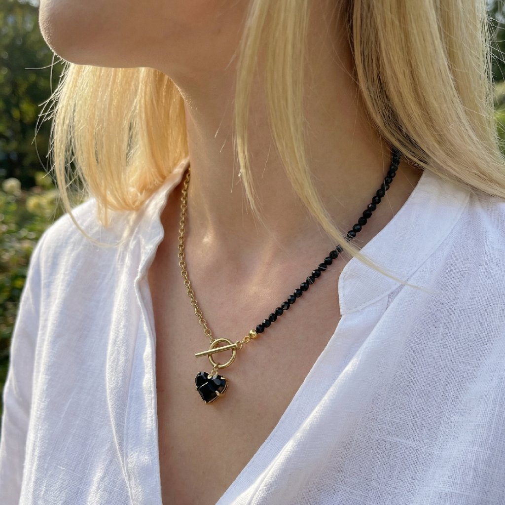 Náhrdelník s černým spinelem. Handmade náhrdelník s černým spinelem je jemným, ale výrazným šperkem, který spojuje eleganci s originalitou ruční práce. Polovina náhrdelníku je tvořena decentním řetízkem, druhá polovina je navlečena z broušeného černého spinelu, který je známý svým hlubokým leskem a nadčasovým vzhledem. Černý spinel je oblíbený minerál spojovaný se silou, ochranou a vnitřní stabilitou. Díky kombinaci minerálů a řetízku je náhrdelník velmi dobře nositelný – hodí se jak k jednoduchému outfitu, tak i k elegantnějšímu stylingu.
