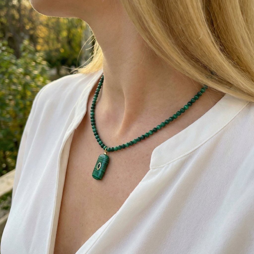 Náhrdelník z malachitu a s přívěskem. Malachit je minerál známý svou hlubokou zelenou barvou a jemnými pruhy, které mu dodávají výraznou osobnost. Náhrdelník působí elegantně a přitom nenuceně, hodí se k dennímu nošení i k slavnostnějším příležitostem. Malachit je tradičně spojován s ochranou, vnitřní silou a růstem. Malachitový náhrdelník tak může být nejen krásným doplňkem a hodí se i jako dárek pro každou ženu.