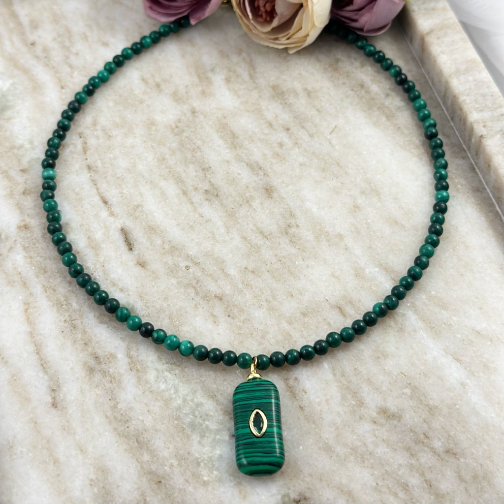 Náhrdelník z malachitu a s přívěskem. Malachit je minerál známý svou hlubokou zelenou barvou a jemnými pruhy, které mu dodávají výraznou osobnost. Náhrdelník působí elegantně a přitom nenuceně, hodí se k dennímu nošení i k slavnostnějším příležitostem. Malachit je tradičně spojován s ochranou, vnitřní silou a růstem. Malachitový náhrdelník tak může být nejen krásným doplňkem a hodí se i jako dárek pro každou ženu.