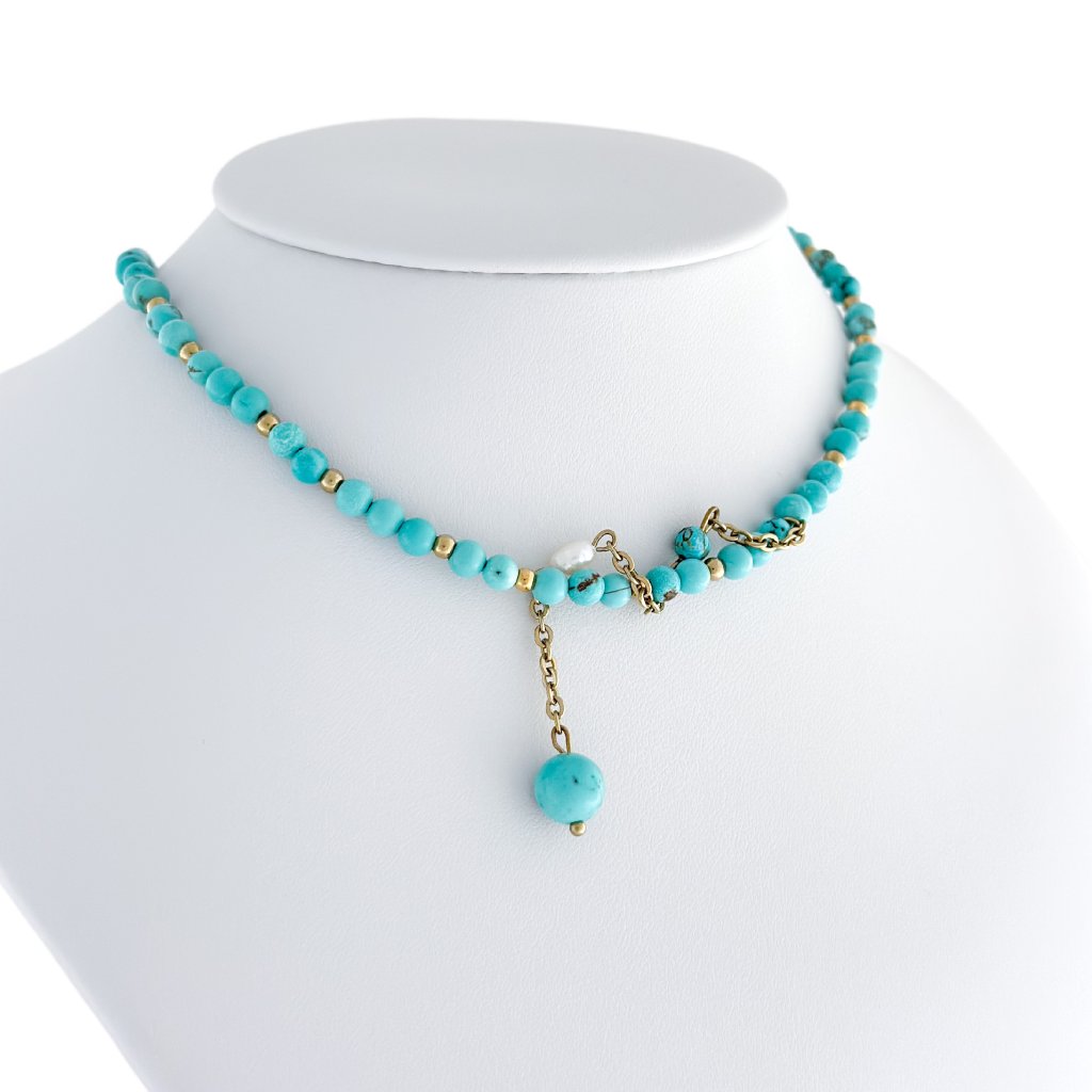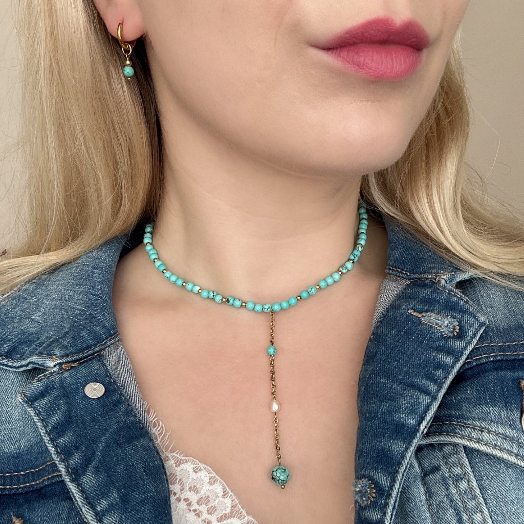 Náhrdelník s rekonstruovaným tyrkysem a říční perlou. Nevšední náhrdelník s tyrkysem zdobí visací část, kterou lze krásně omotat nebo nechat viset jen tak volně. Záleží jen na Vašem stylu. Doplněno o korálky z vysoce odolné chirurgické oceli. Vše je navléknuto na pevném ocelovém lanku. Náhrdelník je navíc doplněn o prodlužující řetízek, takže se krásně přizpůsobí každé velikosti. V případě zájmu Vám náhrdelník upravím na míru.