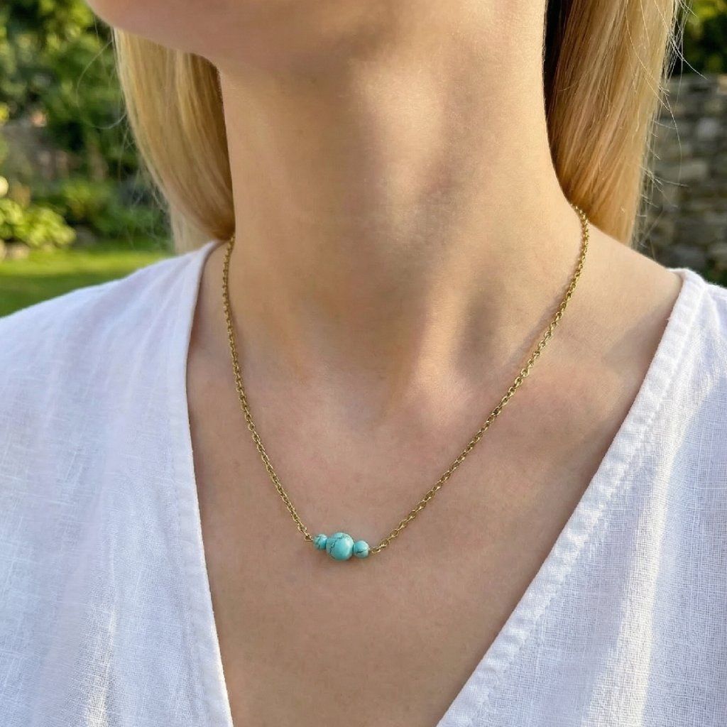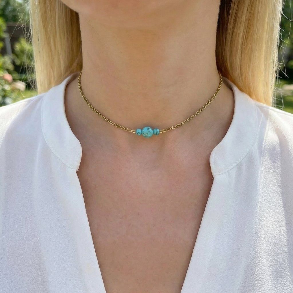 Ručně vyrobený náhrdelník s tyrkysem Athena. Tyrkysové korálky, pečlivě vybrané pro jejich jedinečný odstín, v sobě nesou energii, která podporuje sebevědomí a harmonii. Tento řetízek s tyrkysem je určen pro ženy, které chtějí nosit šperk s příběhem a cítit se silné a chráněné každý den.