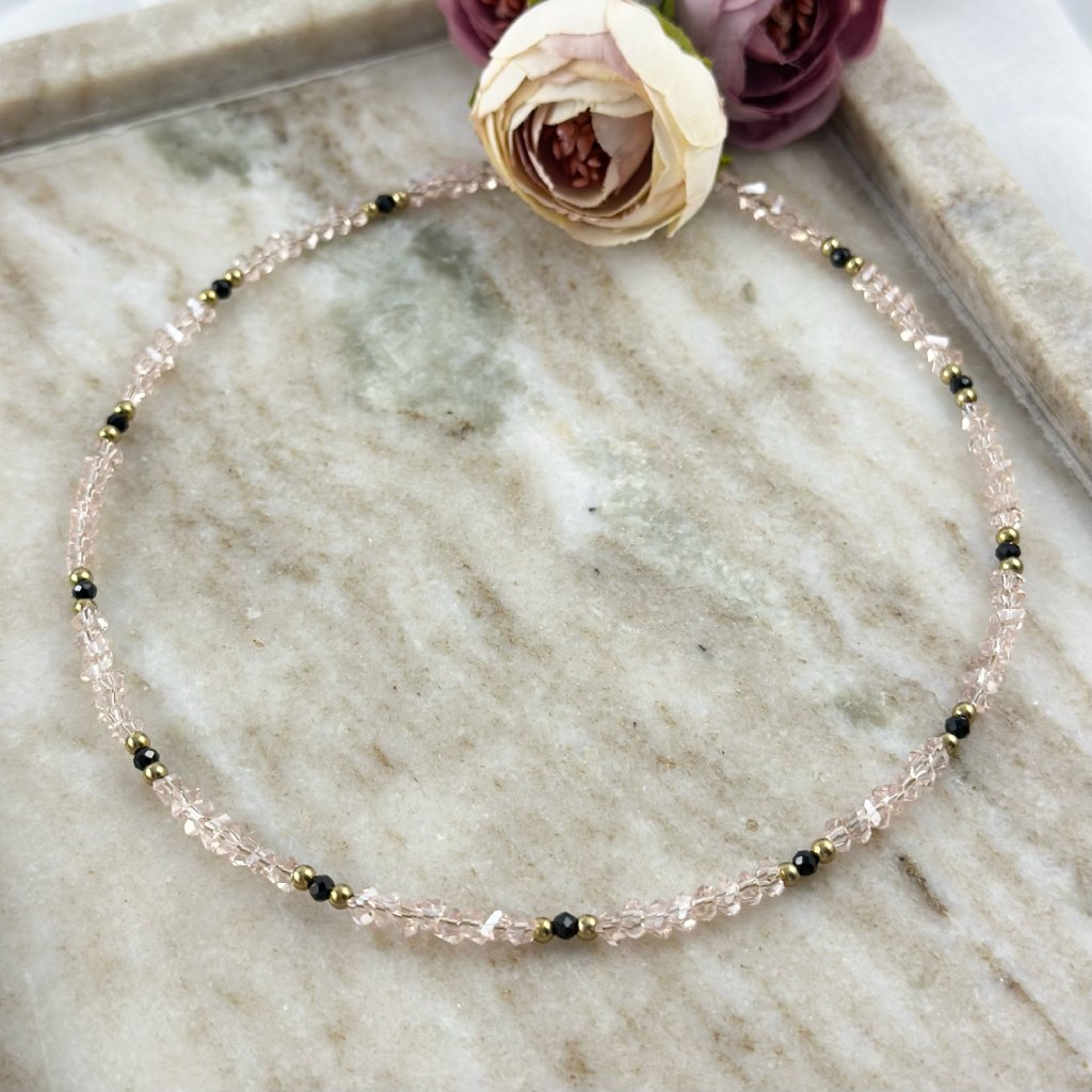 Náhrdelník z broušených skleněných korálků doplněný černým spinelem spojuje jemný třpyt a nadčasovou eleganci s decentní hloubkou tmavého minerálu. Broušené skleněné korálky krásně odrážejí světlo, zatímco černý spinel dodává náhrdelníku moderní kontrast a sofistikovaný nádech. Lehký a vzdušný design je vhodný pro každodenní nošení i slavnostnější příležitosti a díky kombinaci minerálu a skla působí náhrdelník vyváženě a elegantně. Každý kus je ručně vyrobený originál, což zaručuje jeho jedinečnost a vysokou kvalitu zpracování.