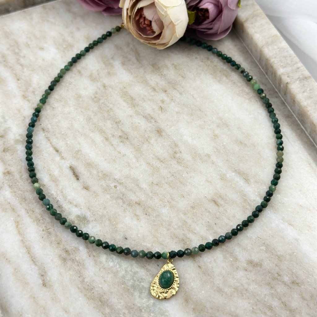 Náhrdelník se smaragdy a přívěskem. Každý korálek je unikátní – lehce se liší odstínem a kresbou, díky čemuž je každý náhrdelník originál. Smaragdové tóny náhrdelníku působí elegantně a zároveň jemně, ideální pro doplnění denního i večerního outfitu. Smaragd je tradičně spojován s láskou, hojností a vnitřní harmonií, takže tento náhrdelník může být nejen stylovým doplňkem, ale i osobním symbolem.