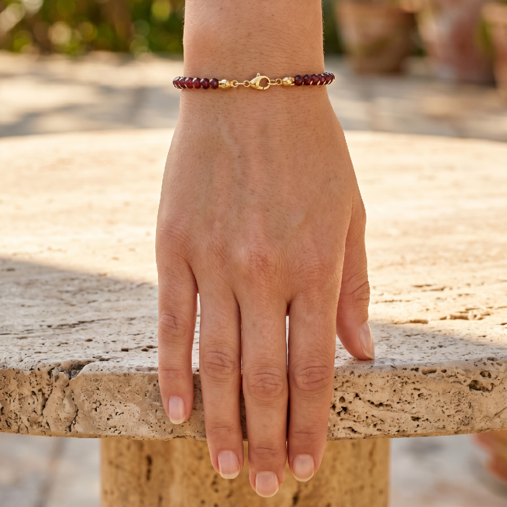 Náramek s přírodním granátem, kamenem vitality a síly. Granát podporuje odhodlání, dodává životní energii a vytrvalost. Tento elegantní náramek z granátu je vyroben na pevném ocelovém lanku pro maximální odolnost. Délku náramku upravím přesně na míru. Lze zakoupit také ve výhodném setu s náušnicemi a náhrdelníkem.