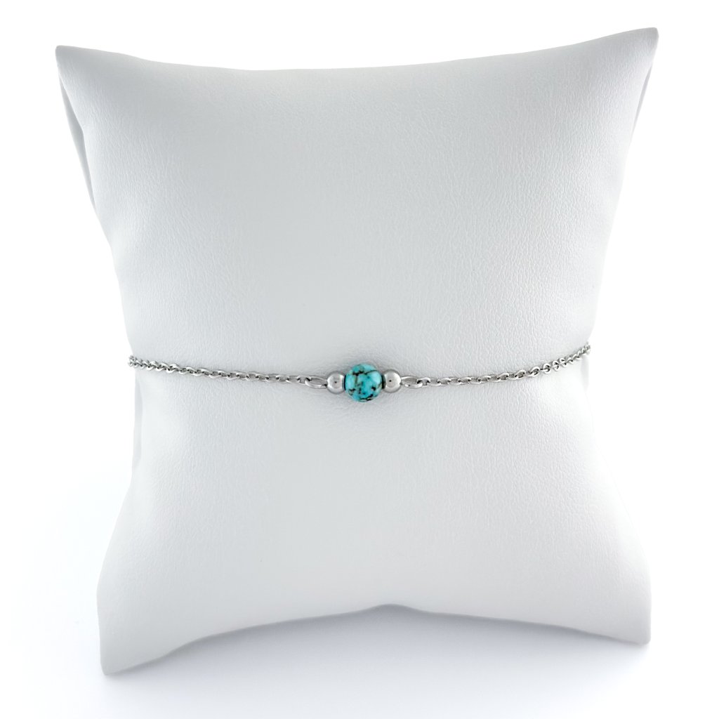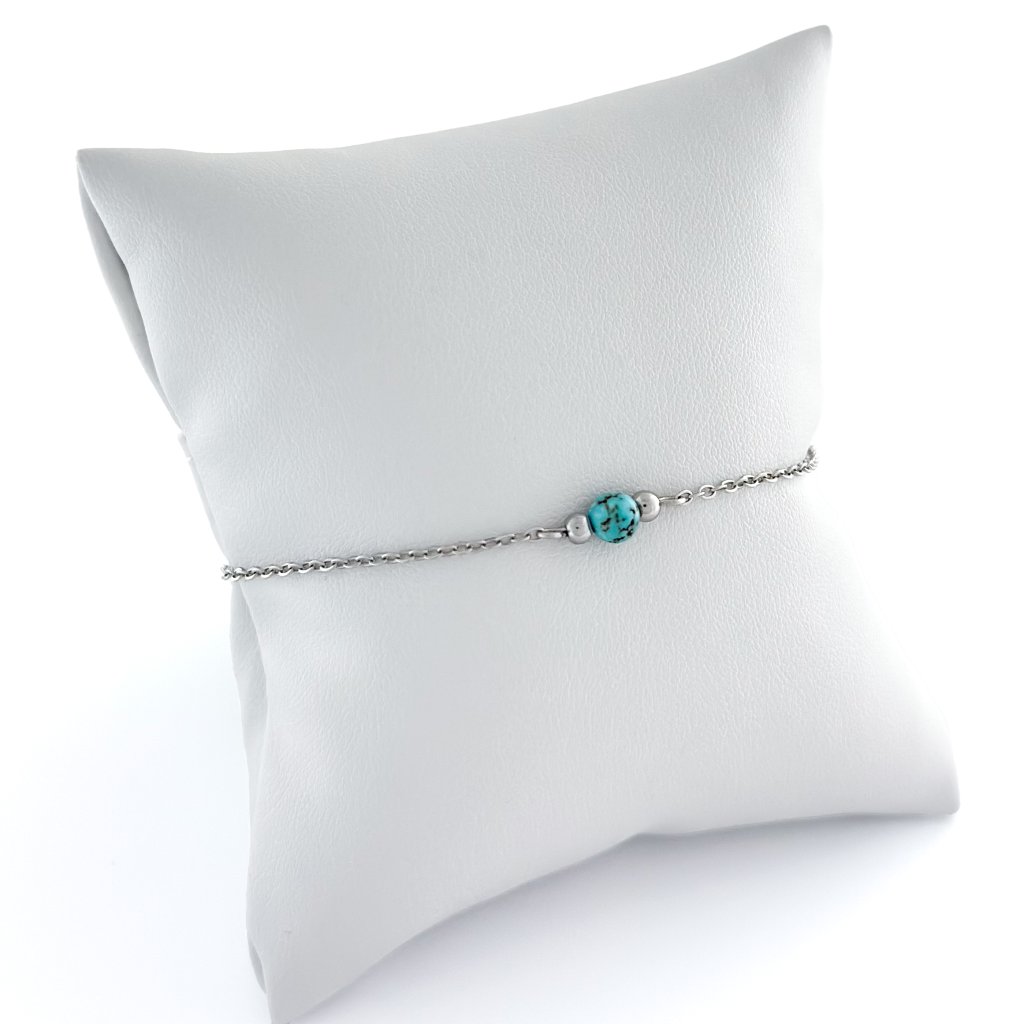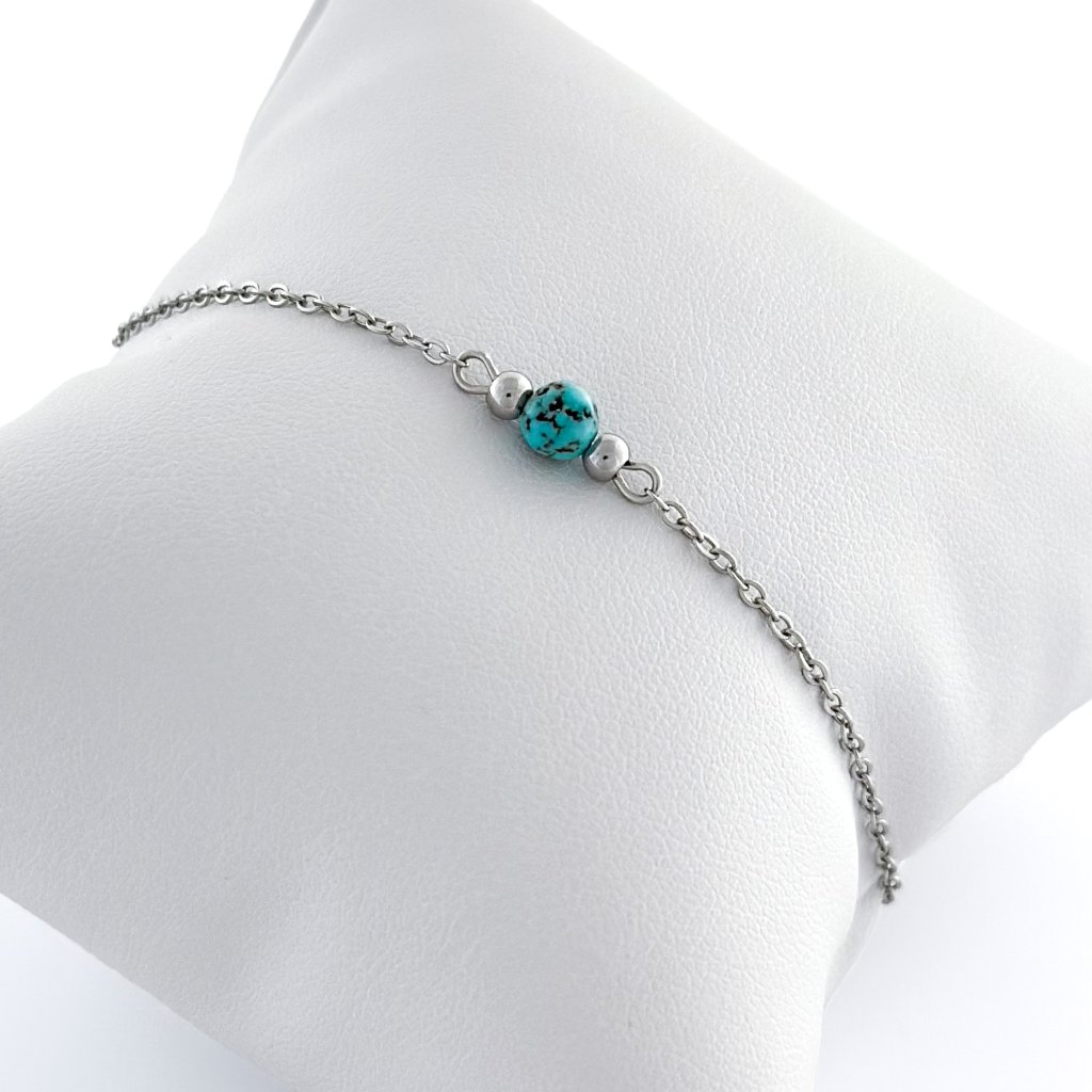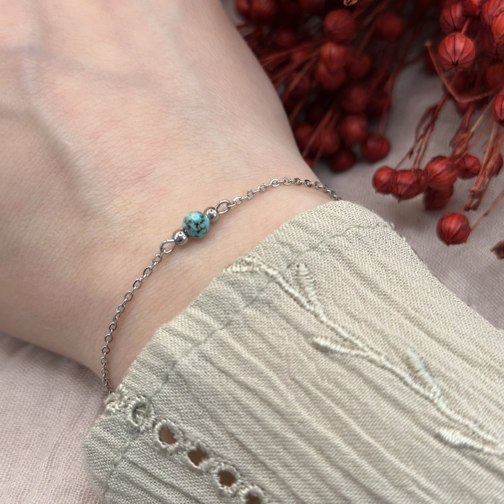 Minimalistický náramek s rekonstruovaným tyrkysem. Jemný řetízek je vyroben z chirurgické oceli, která zaručuje odolnost a stálost náramku. Díky svému decentnímu a nadčasovému provedení je náramek ideální jak na běžné nošení, tak i na speciální příležitosti. Skvěle se kombinuje s jinými šperky. Dostupný ve zlatém a stříbrném odstínu.