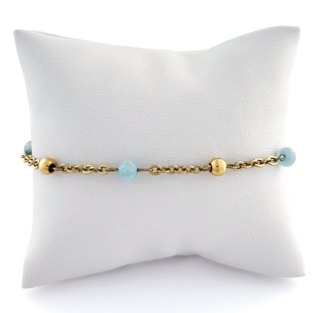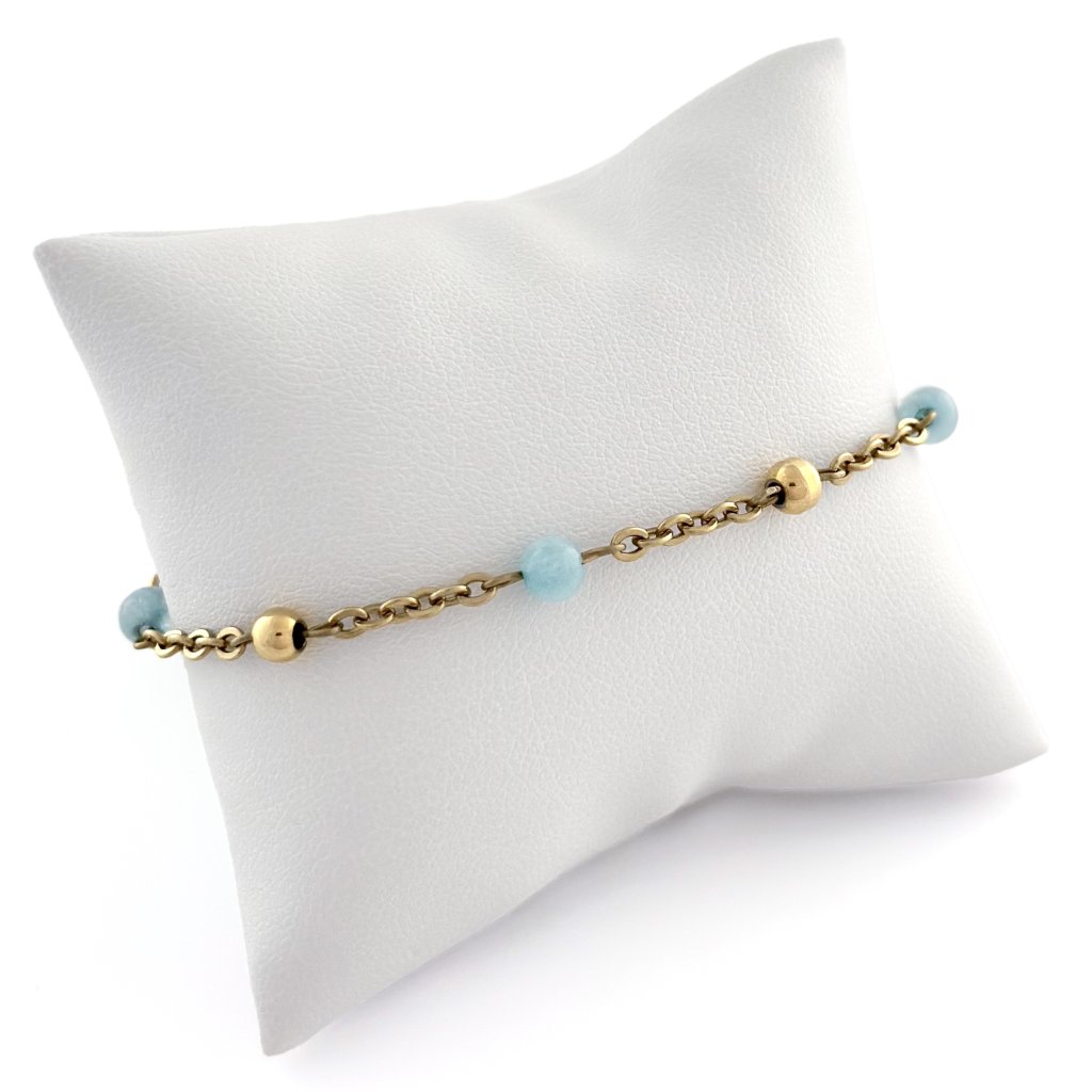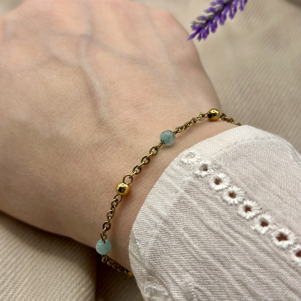 Ručně vyrobený náramek z přírodního akvamarínu. Náramek z akvamarínu je doplněn o korálky z chirurgické oceli. Akvamarín je nádherný modrý kámen. Jeho účinky pocítíme, když potřebujeme ulevit od kašle či astmatu. Dokáže mírnit nachlazení a bolesti zubů. Náramek s akvamarínem Vám vyrobím ve stříbrném i zlatém odstínu. K tomuto náramku nabízím i náhrdelník s akvamarínem ve stejném stylu. Délku Vám upravím na míru.