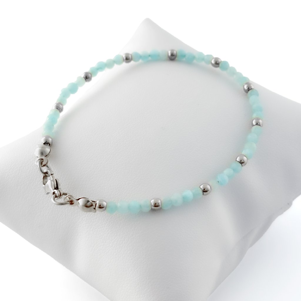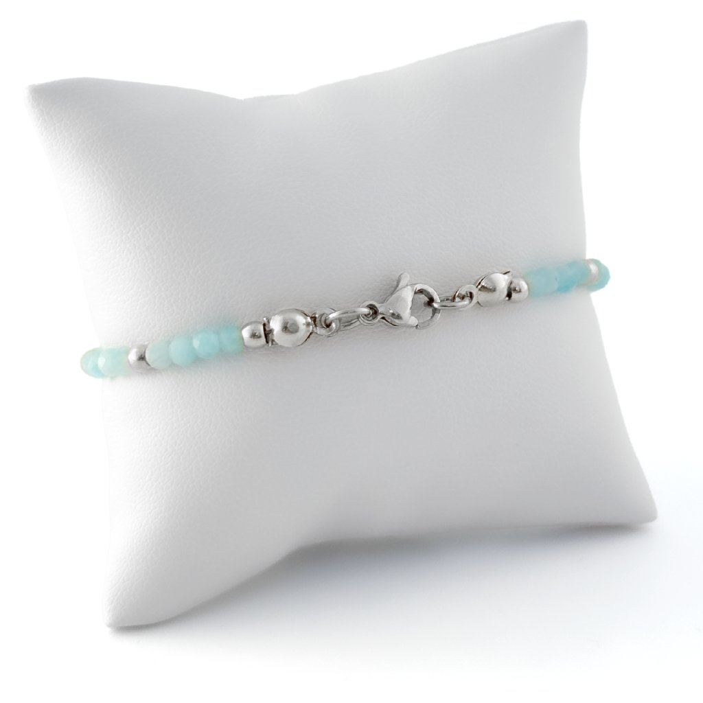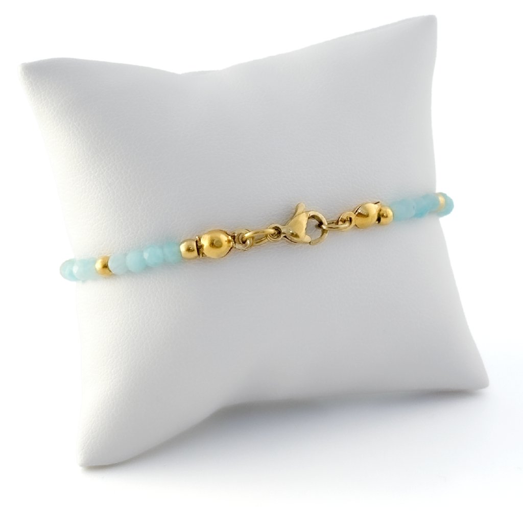 Náramek s přírodním amazonitem. Náramek Rossano je zdoben korálky z přírodního amazonitu. Amazonit je mimořádně uklidňující kámen. Podporuje vitalitu a pomáhá zklidnit tělo i mysl. Korálky a ostatní komponenty jsou z odolné chirurgické oceli, která je voděodolná a hypoalergenní. Náramek s amazonitem Rossano vyrábím ve stříbrném i zlatém odstínu. Možné zakoupit i ve výhodném setu s náhrdelníkem a náušnicemi.