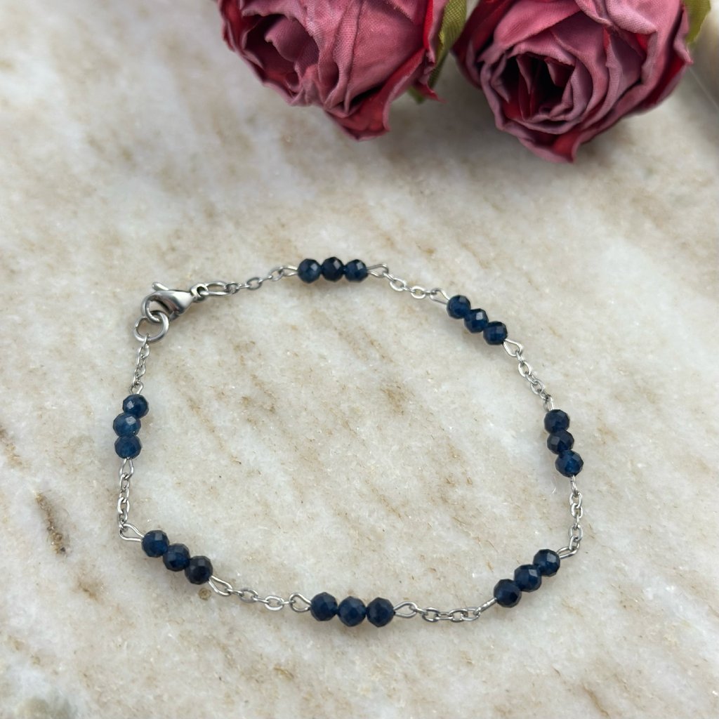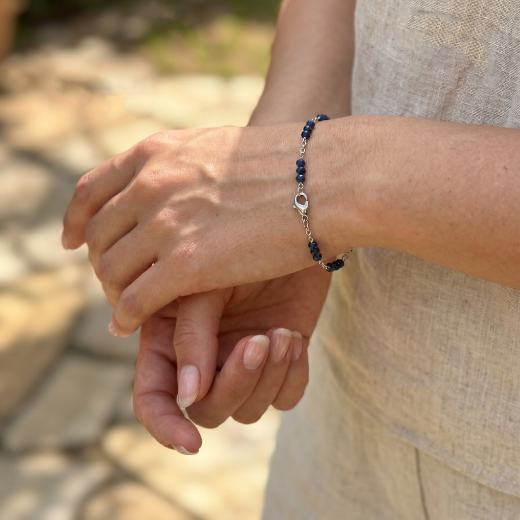 Jemný safírový náramek. Každý safír je pečlivě vybraný, aby se jeho hluboký modrý odstín rozzářil při každém pohybu zápěstí. Jemný řetízek dodává lehkost a přirozenou eleganci, díky čemuž náramek působí současně decentně i výjimečně. Díky minimalistickému pojetí se safír stává hlavní hvězdou šperku a nechává vyniknout jeho přirozenou krásu. Perfektně se hodí pro každodenní nošení, ale podtrhne i slavnostní outfity či výjimečné chvíle.