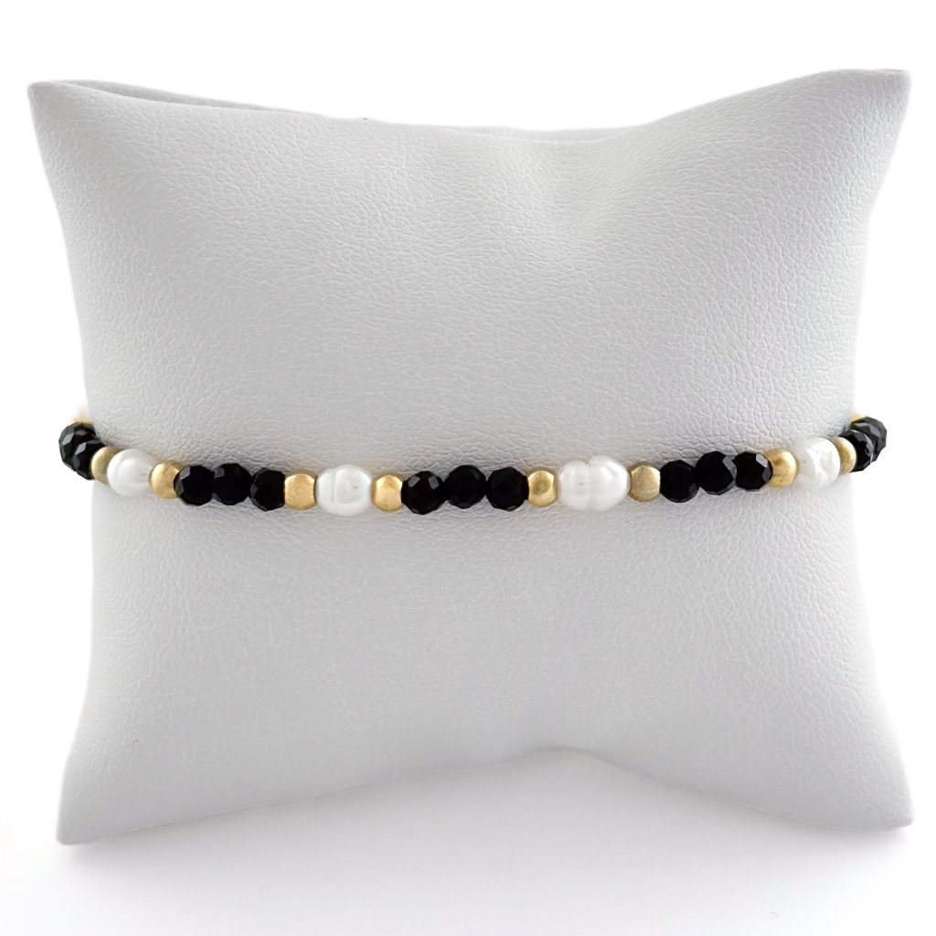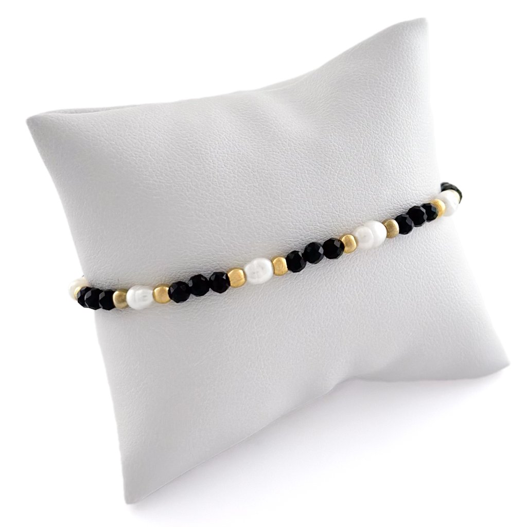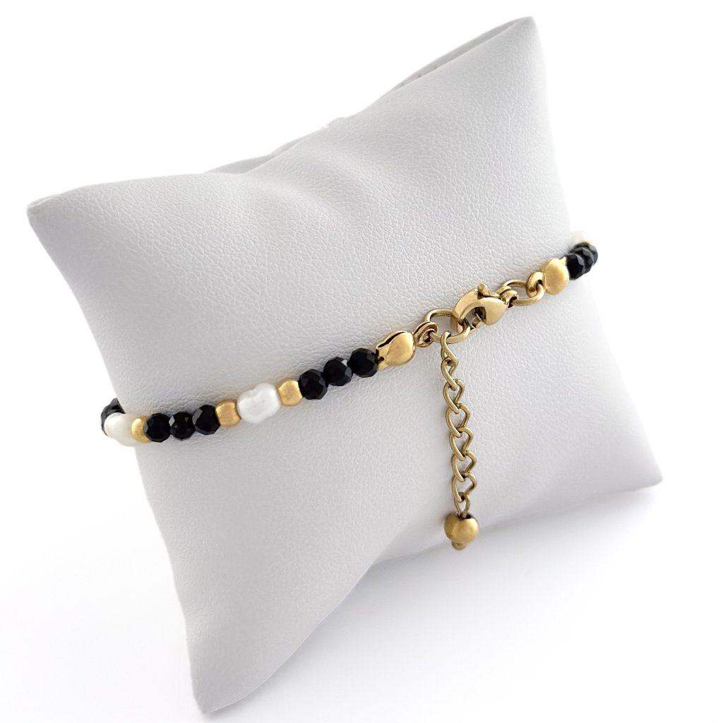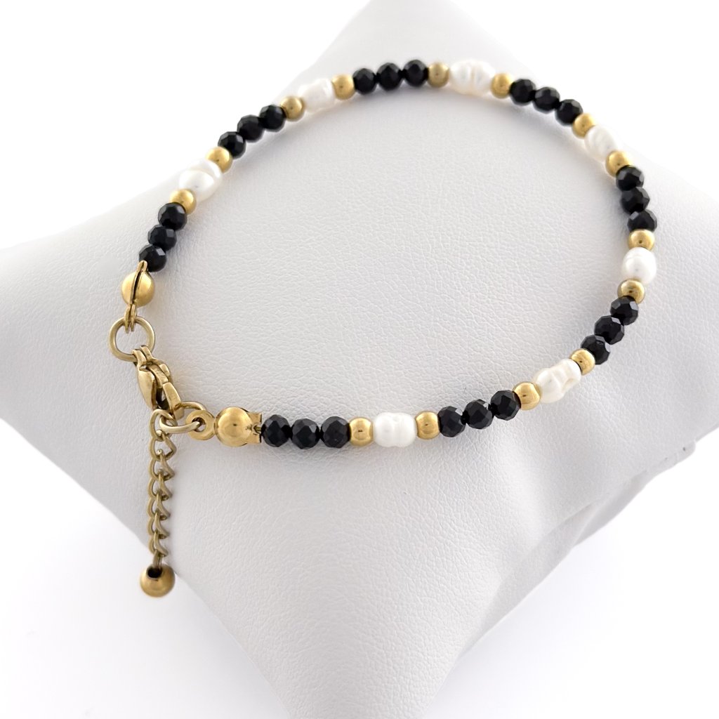 Náramek s černým spinelem a s říčními perlami. Náramek je vyroben z minerálu spinelu a říčních perel. Korálky jsou z chirurgické oceli. Vše navléknuto na pevném ocelovém lanku, aby předešlo jeho roztržení. Spinel je minerál, známý také jako korund. Je to ochranný kámen, který pomáhá dosáhnout úspěchu. Podporuje duševní sílu a sebevědomí. Na náramek z perel a spinelu je napojen prodlužující řetízek, takže se skvěle přizpůsobí každé velikosti.
