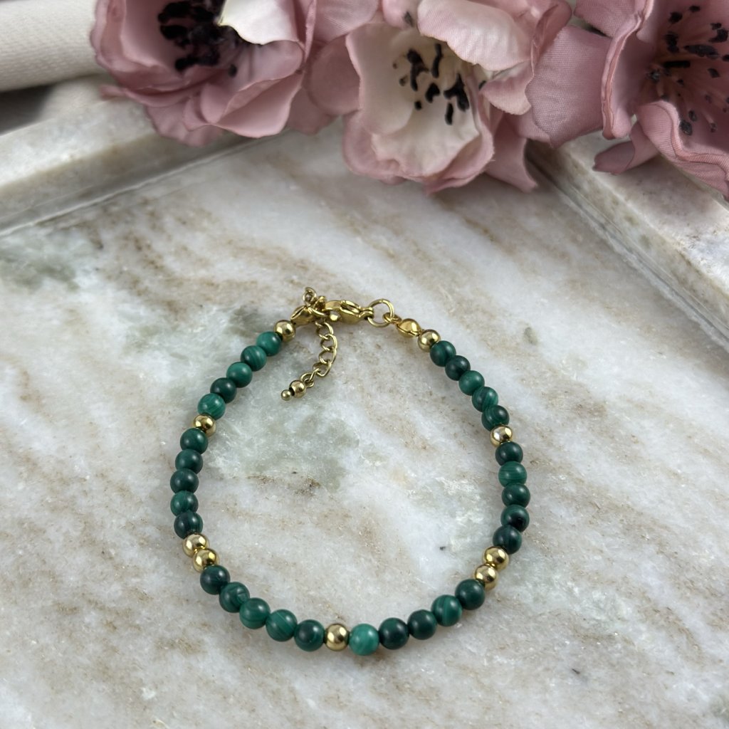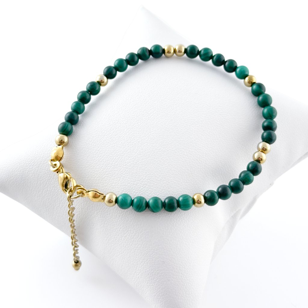 Ručně vyrobený náramek s malachitem. Malachit je kámen, který přitahuje pohledy svými výraznými zelenými vzory a zároveň působí jako silný ochranný talisman. Tento zelený náramek z malachitu propojuje přírodní energii s osobitým stylem.