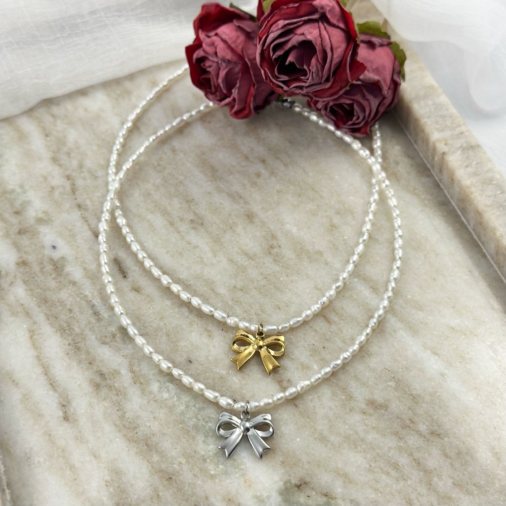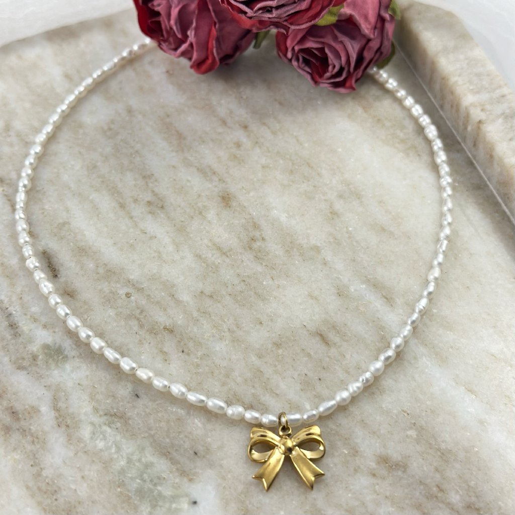 Náhrdelník z malých říčních perel s přívěskem mašle. Perlový náhrdelník je vyroben z pravých sladkovodních rýžových perel a doplněn o maličký korálek z chirurgické oceli. Díky prodlužovacímu řetízku se náhrdelník z malých říčních perel snadno přizpůsobí Vašim potřebám, a pokud si přejete něco navíc, délku Vám upravím přesně na míru. Tento šperk je vyráběn ručně, s důrazem na detail, kvalitu a preciznost.