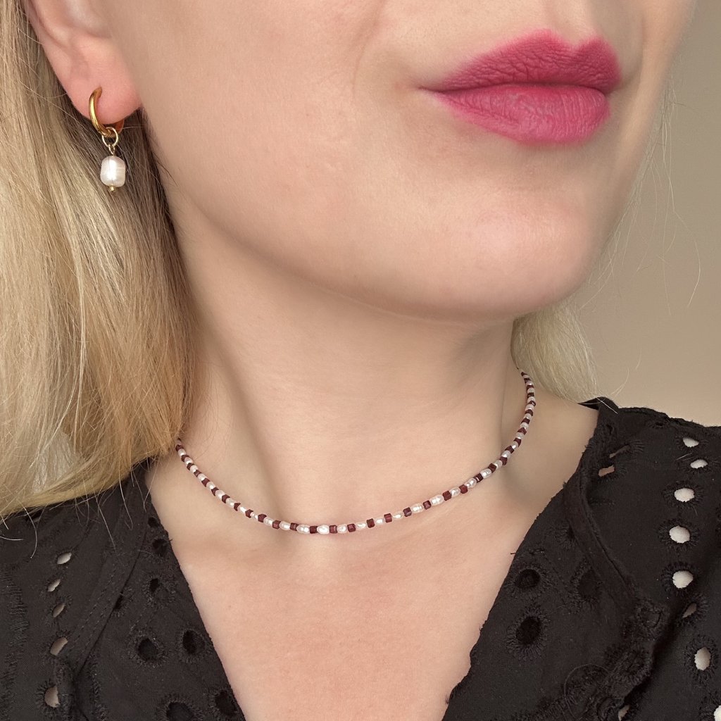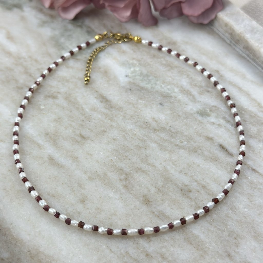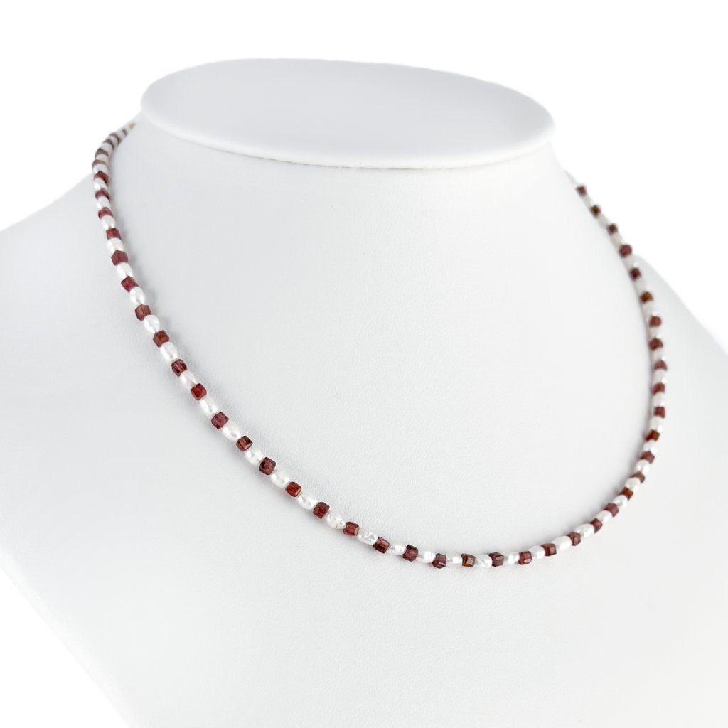 Náhrdelník z říčních perel a granátem. Perlový náhrdelník Vera spojuje jemné říční perly s vášnivým granátem, čímž vytváří nadčasový klenot, který podtrhne vaši krásu. Tento náhrdelník s perlami je ideální volbou pro každodenní nošení i speciální příležitosti. Granát přidává nádech intenzity a sofistikovanosti, zatímco perly zůstávají symbolem čistoty a elegance.