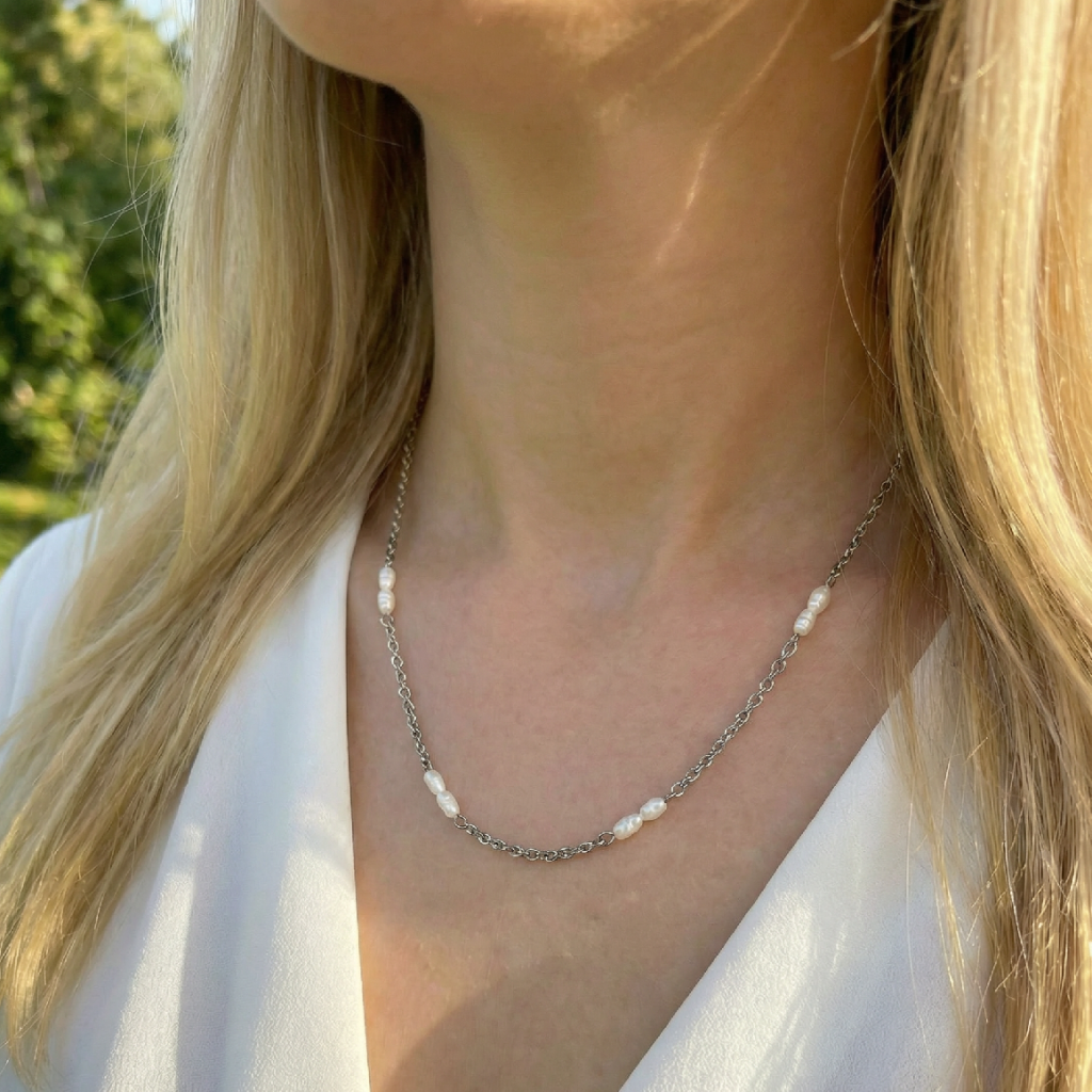 Perlový náhrdelník Enna je zdoben jemnými říčními perličkami, které dodávají tomuto šperku elegantní a nadčasový vzhled. Je perfektní pro vrstvení s dalšími náhrdelníky či řetízky, ale vypadá nádherně i samostatně. Tento náhrdelník z pravých říčních perel je připomínkou, že v jednoduchosti se skrývá opravdová krása.
